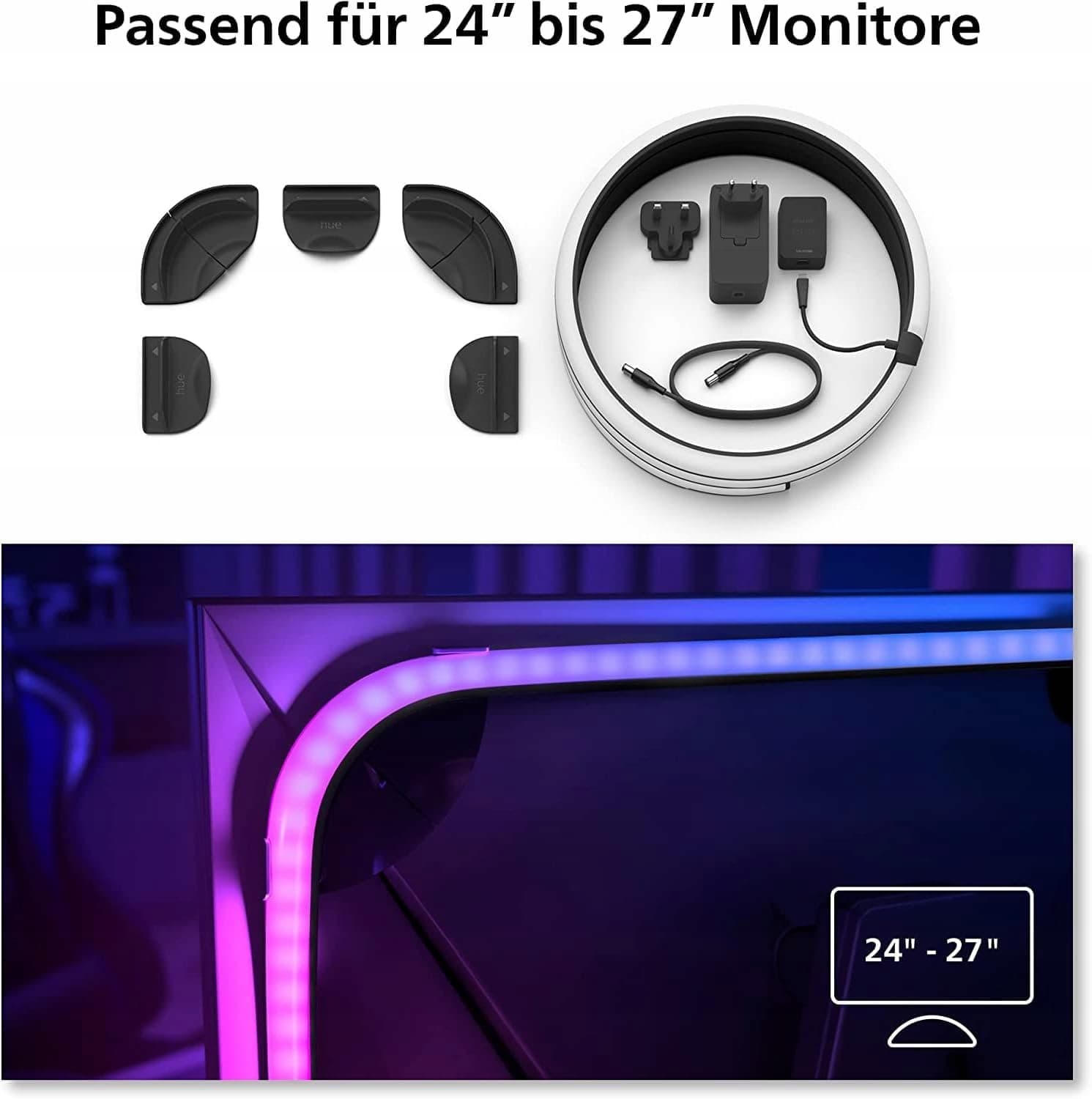 Stworzony dla monitorów: Play Gradient Lightstrip dla monitorów został stworzony dla monitorów 24' do 27'. Łatwy do zamocowania z tyłu za pomocą systemu klipsów
