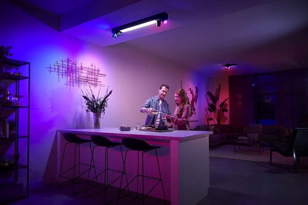 Łatwa instalacja: Dołączone do zestawu reflektory GU10 są umieszczane w oprawkach lamp, następnie montowane na suficie i łączone z aplikacją Hue