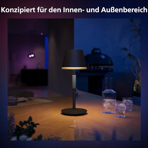 Zaprojektowana do użytku wewnątrz i na zewnątrz: Przenośna lampka stołowa Philips Hue Go ma klasę ochrony IP54, co oznacza, że jest chroniona przed kurzem i rozpryskami wody - można ją więc zdjąć ze stacji ładującej w domu i używać na zewnątrz.