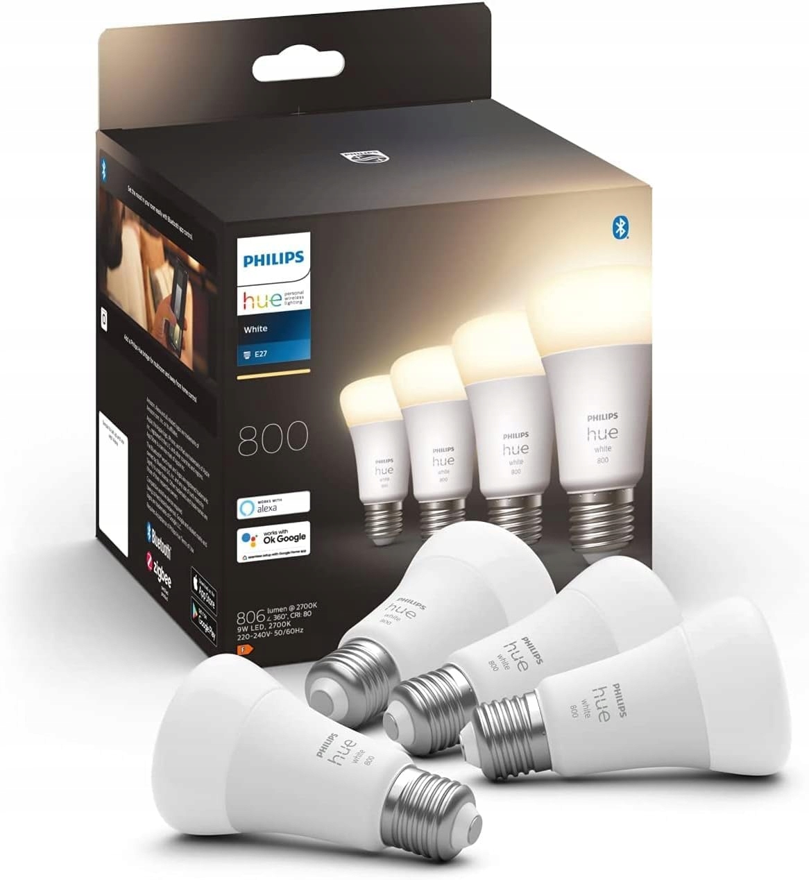 Philips Hue White E27 Czteropak 4x800lm, ciepłe białe światło, ściemnialne, sterowane przez aplikację, kompatybilne z Amazon Alexa (Echo, Echo Dot)