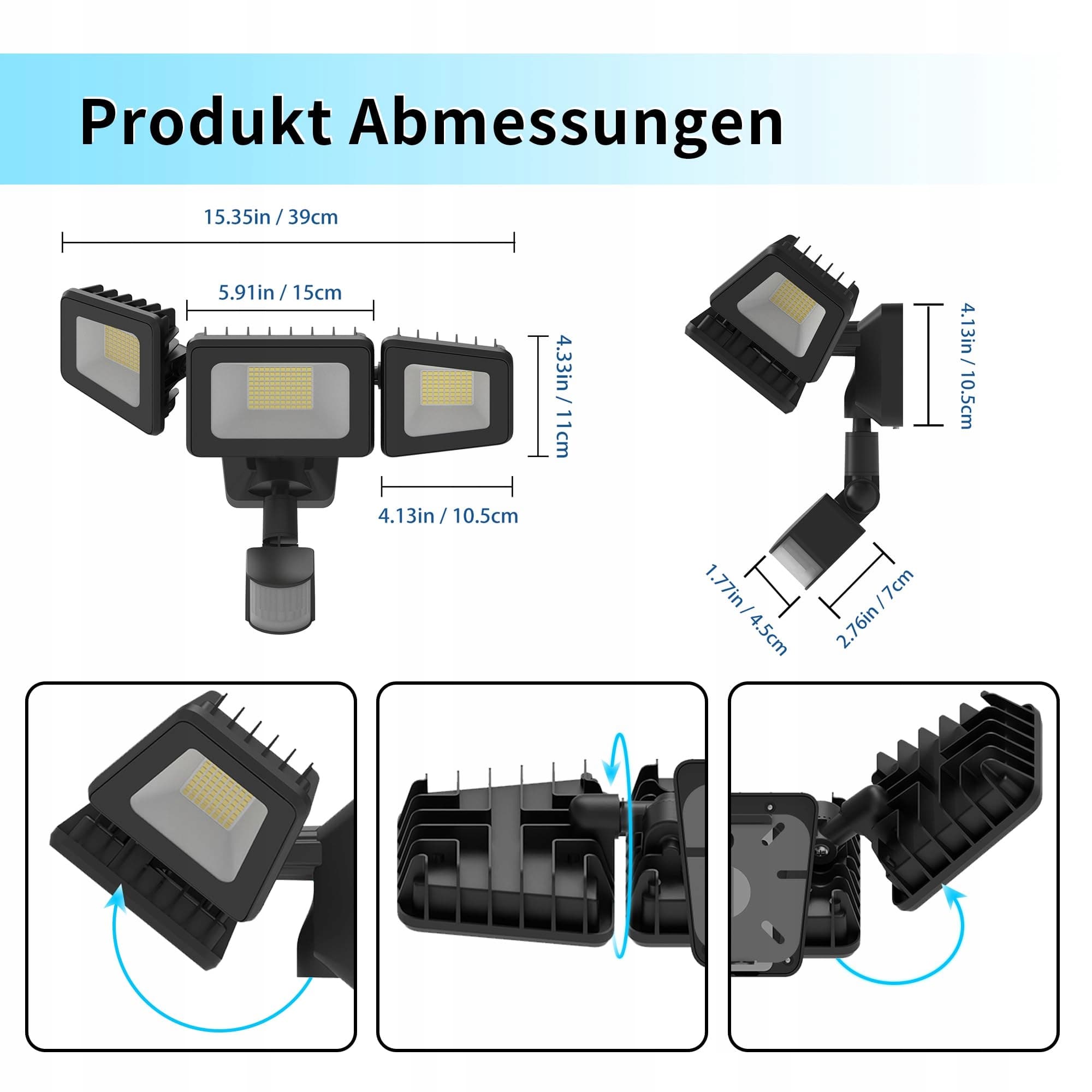 【Elastyczny design z 3 głowicami】 Dzięki elastycznemu i regulowanemu designowi z trzema głowicami nasza zewnętrzna lampa LED pozwala dostosować kąty oświetlenia według potrzeb. Te trzy głowice oferują szerszy kąt świecenia i większy zasięg w porównaniu z innymi dostępnymi na rynku lampami 100 W z trzema głowicami. Naturalne białe światło o temperaturze barwowej 4500 K zapewnia optymalną widoczność i poprawia ogólne wrażenia z oświetlenia.