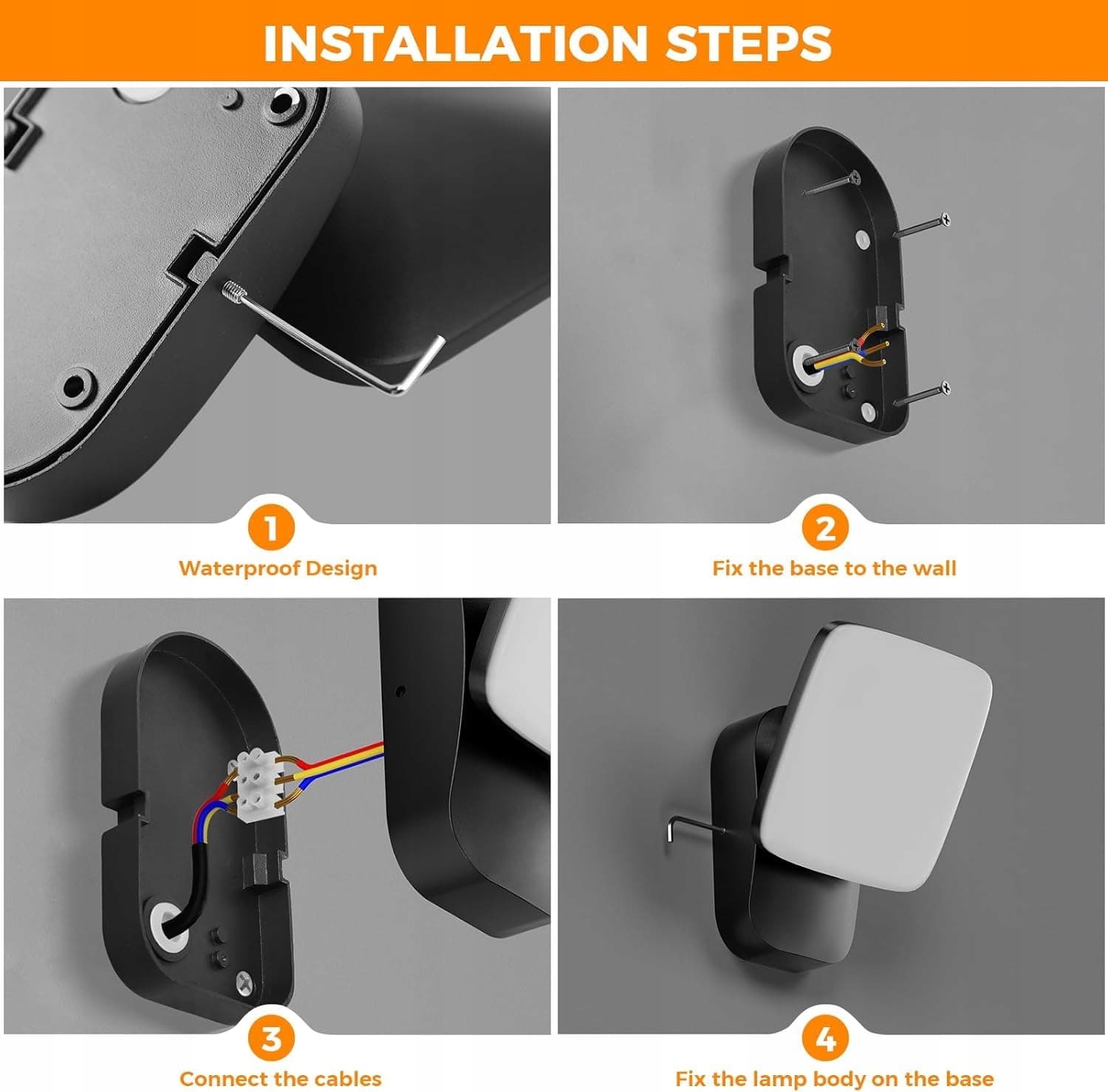 ŁATWA INSTALACJA - Przygotowaliśmy nie tylko instrukcję i zestaw montażowy, ale także 4 wodoodporne pierścienie uszczelniające do śrub, które zapobiegają przedostawaniu się pary wodnej przez otwory na śruby do lampy ściennej. Cały proces instalacji jest bardzo prosty.
