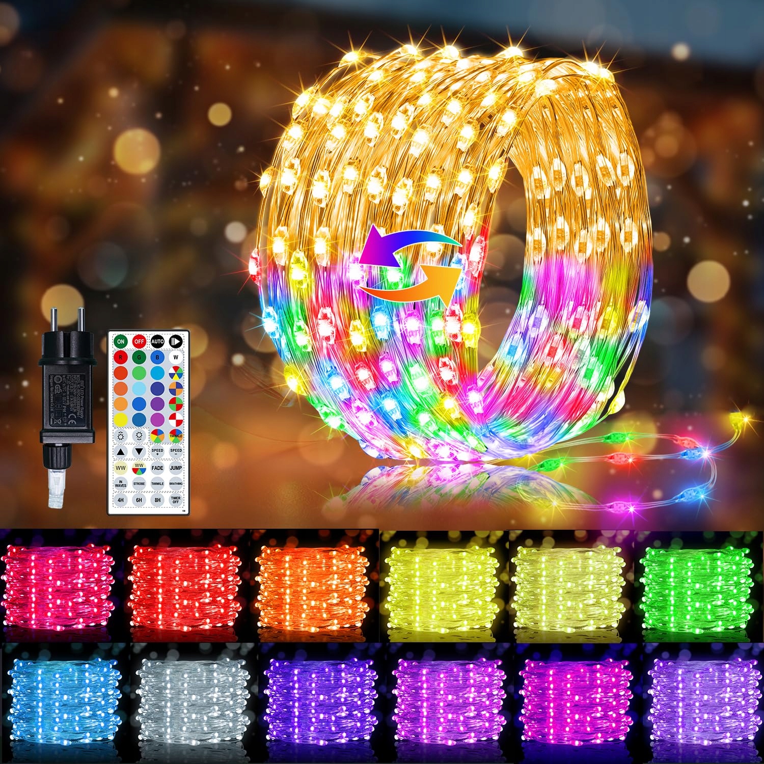 Łańcuch świetlny do wnętrz z wtyczką, 15M 150 LED łańcuch świetlny i pilot, ciepła biel & RGB, 150 trybów, łańcuch świetlny z miedzianego drutu do użytku na zewnątrz i wewnątrz na Boże Narodzenie, imprezy, ogród