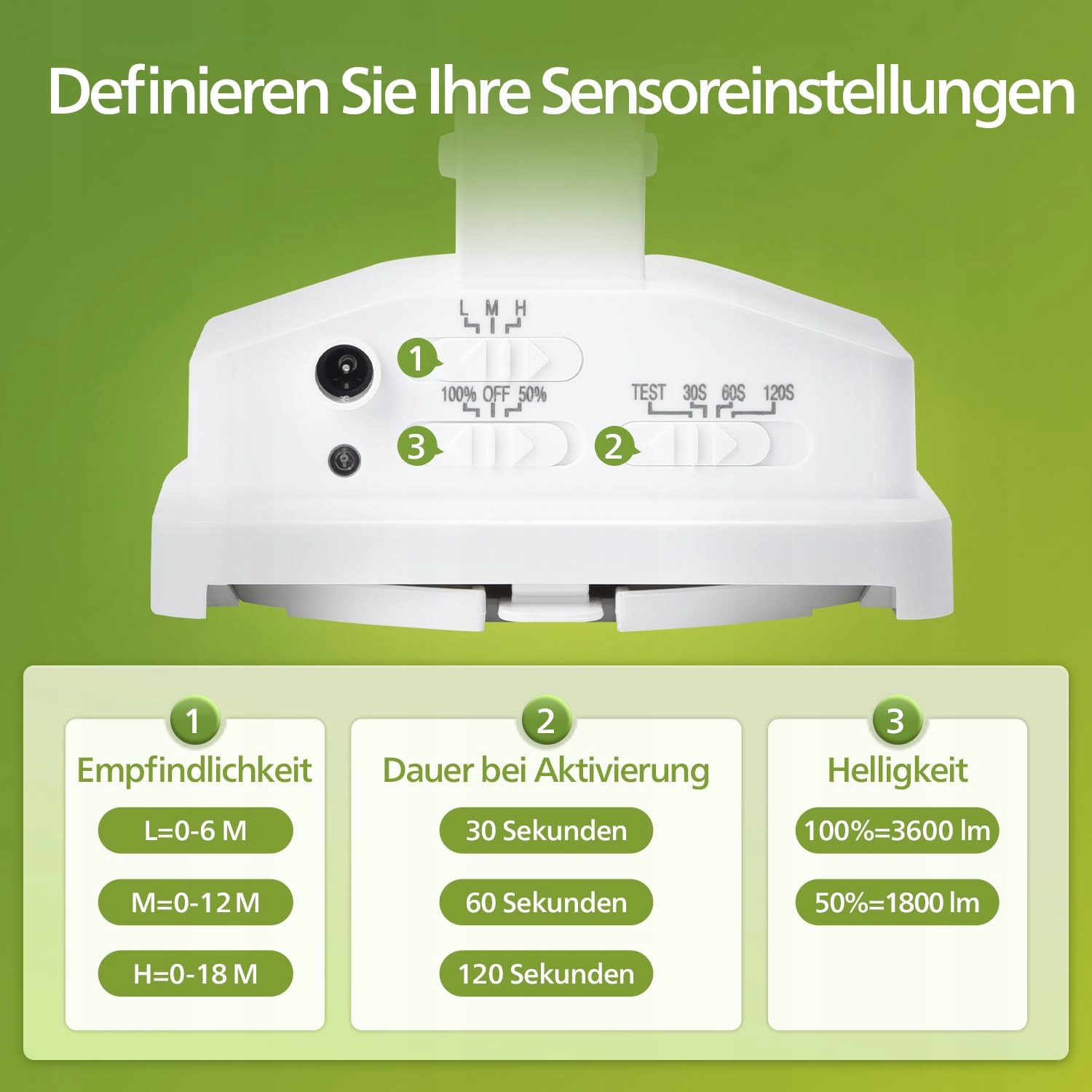 WYSOCE CZUŁY CZUJNIK Z REGULOWANYM ZAKRESEM – Pasywny czujnik podczerwieni (PIR) wykrywa ruch w kącie 180°, z regulowanym zasięgiem (0-18 m) oraz czasem świecenia (30-120 sekund)
