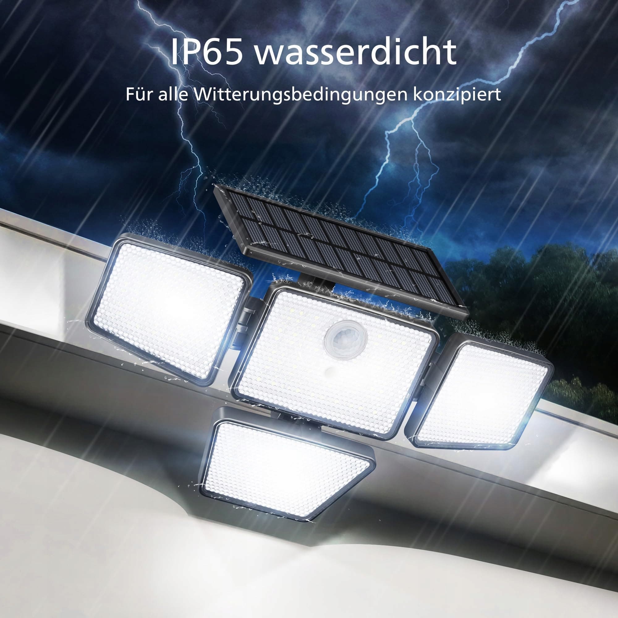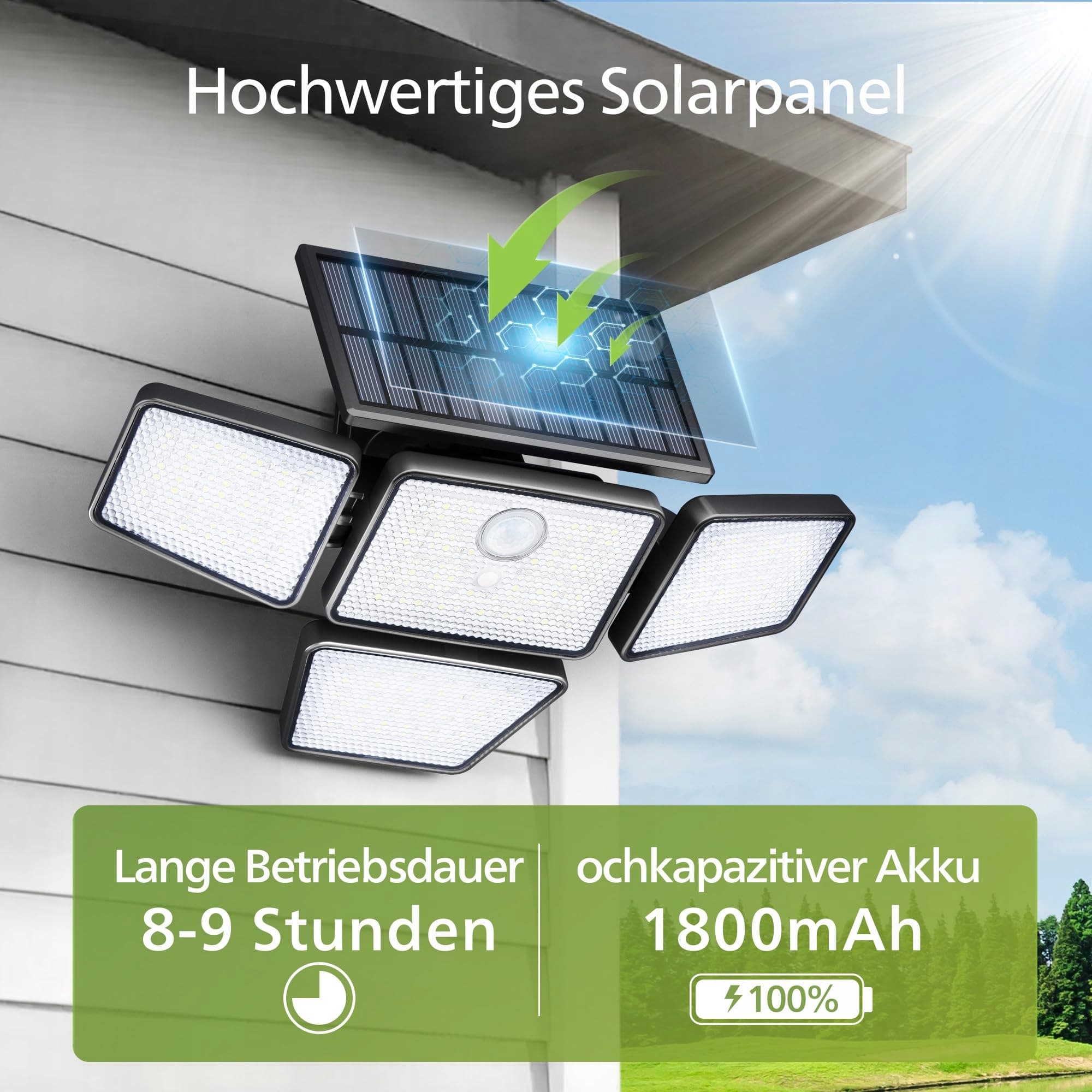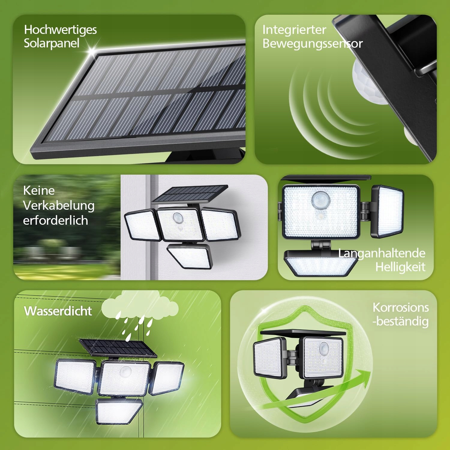 MOCNE ŚWIATŁO I SZEROKI KĄT PROMIENIOWANIA - Nasza solarna lampa naświetlająca ma 196 jaśniejszych diod LED 7500K oraz trzy poziomy jasności (100%/60%/30%). Dzięki 4 regulowanym głowicom lampy światło jest szeroko rozproszone, aby sprostać Twoim potrzebom