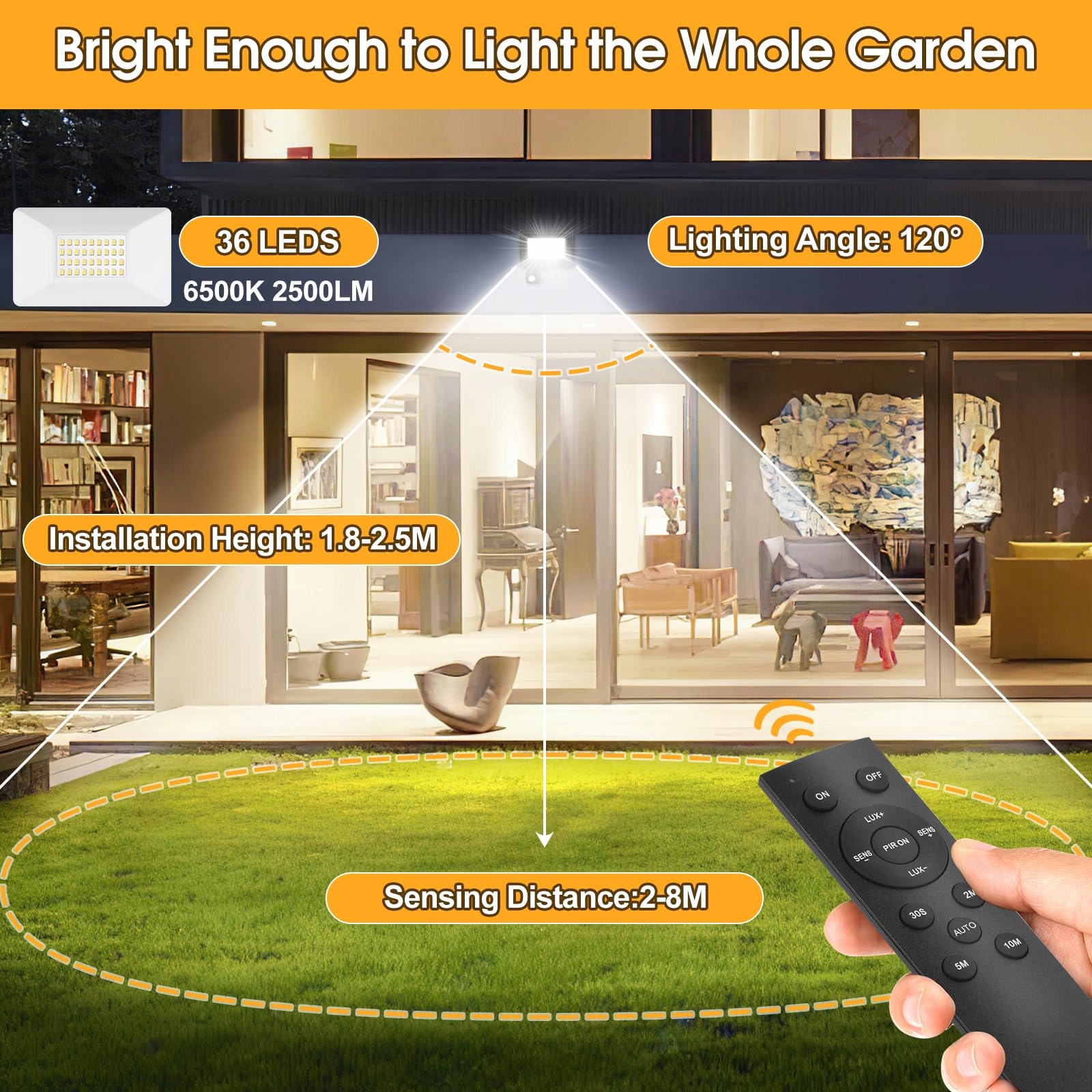 30W LED reflektor z czujnikiem ruchu na zewnątrz - 2 sztuki lampy zewnętrznej z pilotem, 6500K zimna biel superjasna lampa do wnętrz i na zewnątrz, IP66 wodoodporna lampa zewnętrzna do ogrodu, garażu, podwórka, mieszkania, podwórka