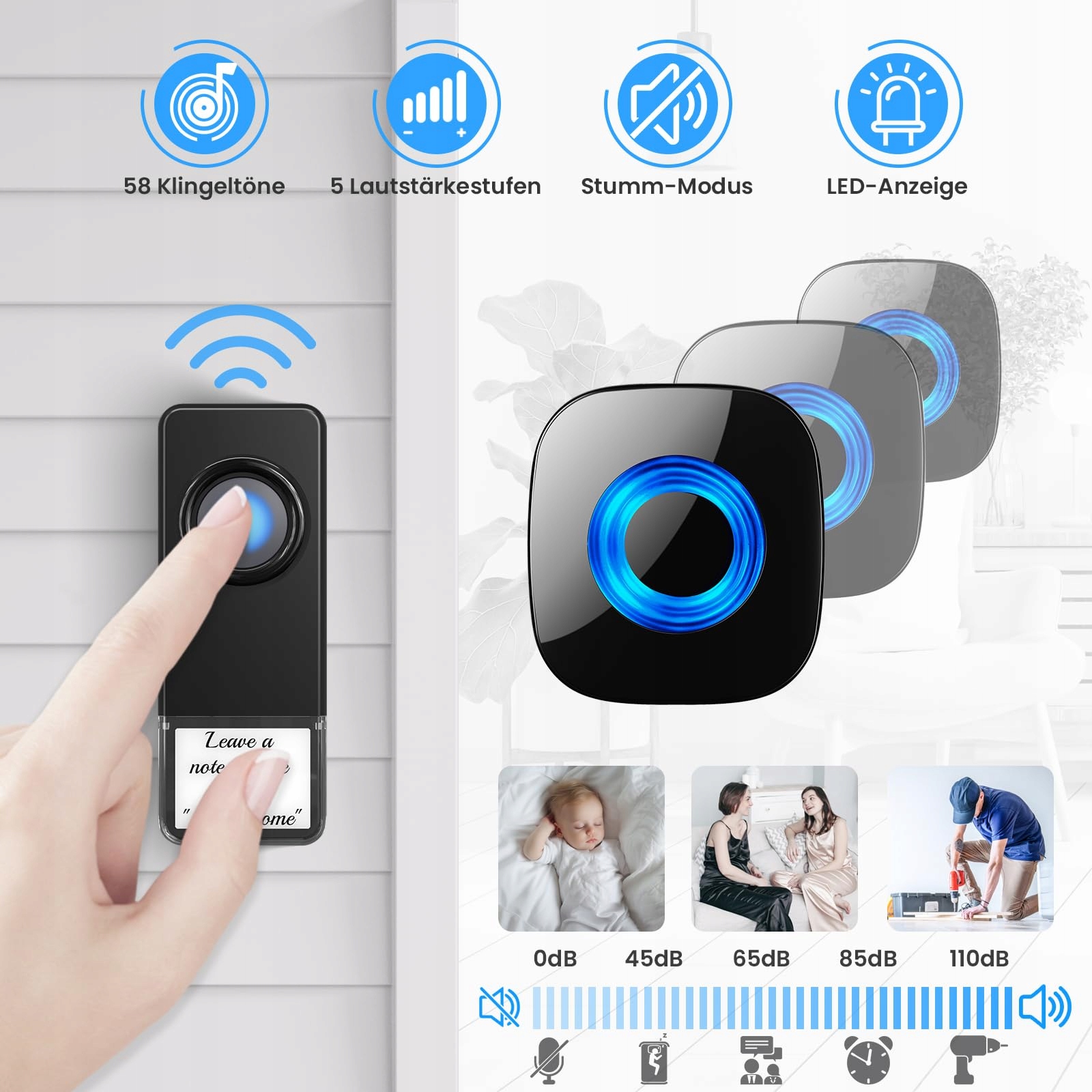 🔔【 400 metrów dużego zasięgu】Duży zasięg działania do 400 m/1,312 FT. Silny i stabilny sygnał radiowy zapewnia, że dźwięk dzwonka jest wyraźnie słyszalny, nie zakłócając innych urządzeń w Twoim domu ani w domach sąsiadów.