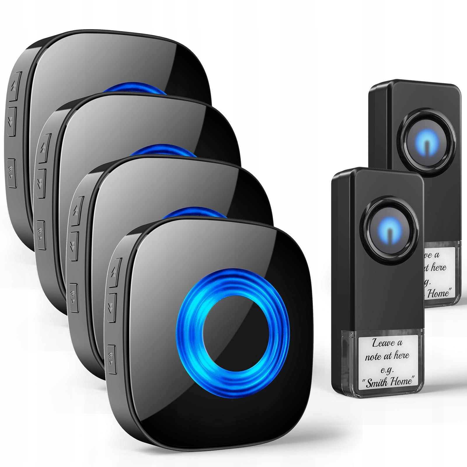 PHYSEN Dzwonek bezprzewodowy, Zestaw dzwonków bezprzewodowych, IP55 Wodoodporny na zewnątrz, Bezprzewodowy dzwonek 400m zasięgu, Zestaw dzwonka do drzwi z 4 odbiornikami Plug-In i 2 nadajnikami, 58 melodii dzwonka z LED-flashem