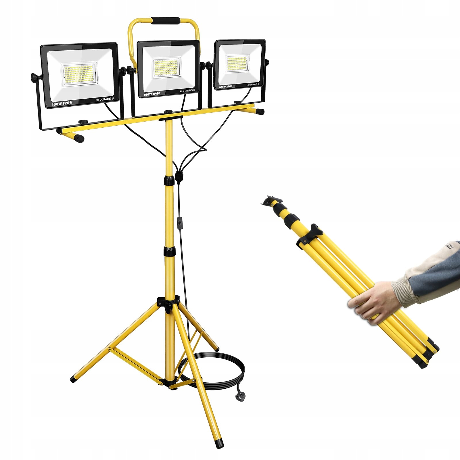 PICAA LED Reflektor budowlany z trójnogiem 3x 100W(300W) Zimna biel Reflektor budowlany, Reflektor LED do pracy Wodoodporny IP66 do garażu, ogrodu, placu budowy