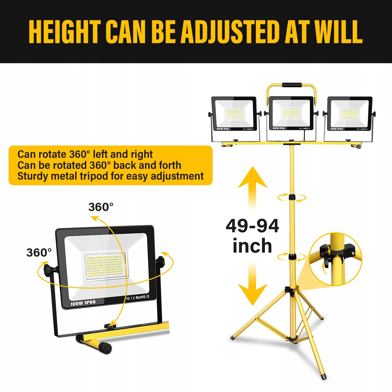 Teleskopowy trójnóg można rozciągnąć od 49 cali do 94 cali. Każda głowica lampy może obracać się poziomo o 360° i przechylać się pionowo o 270°, co pozwala na dostosowanie kąta oświetlenia. Z 5-metrowym kablem, który zapewnia dużą wygodę