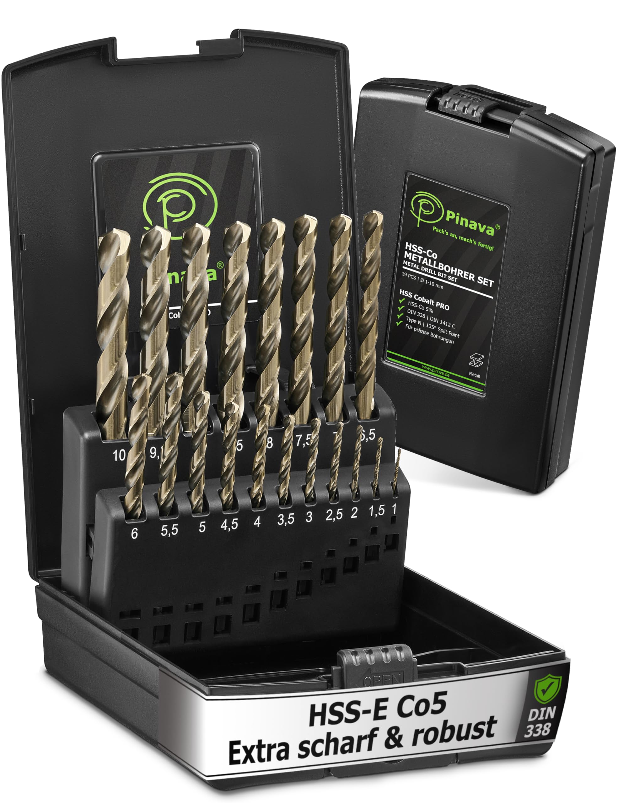 Zestaw wierteł Pinava® HSS Cobalt Pro [Ekstremalnie ostre i wytrzymałe] 19 szt. Profesjonalne wiertła do stali nierdzewnej, stali, żelaza itd. - Precyzyjne wiertła ze stali nierdzewnej, samocentrujące, 1-10mm, kroki co 0.5mm