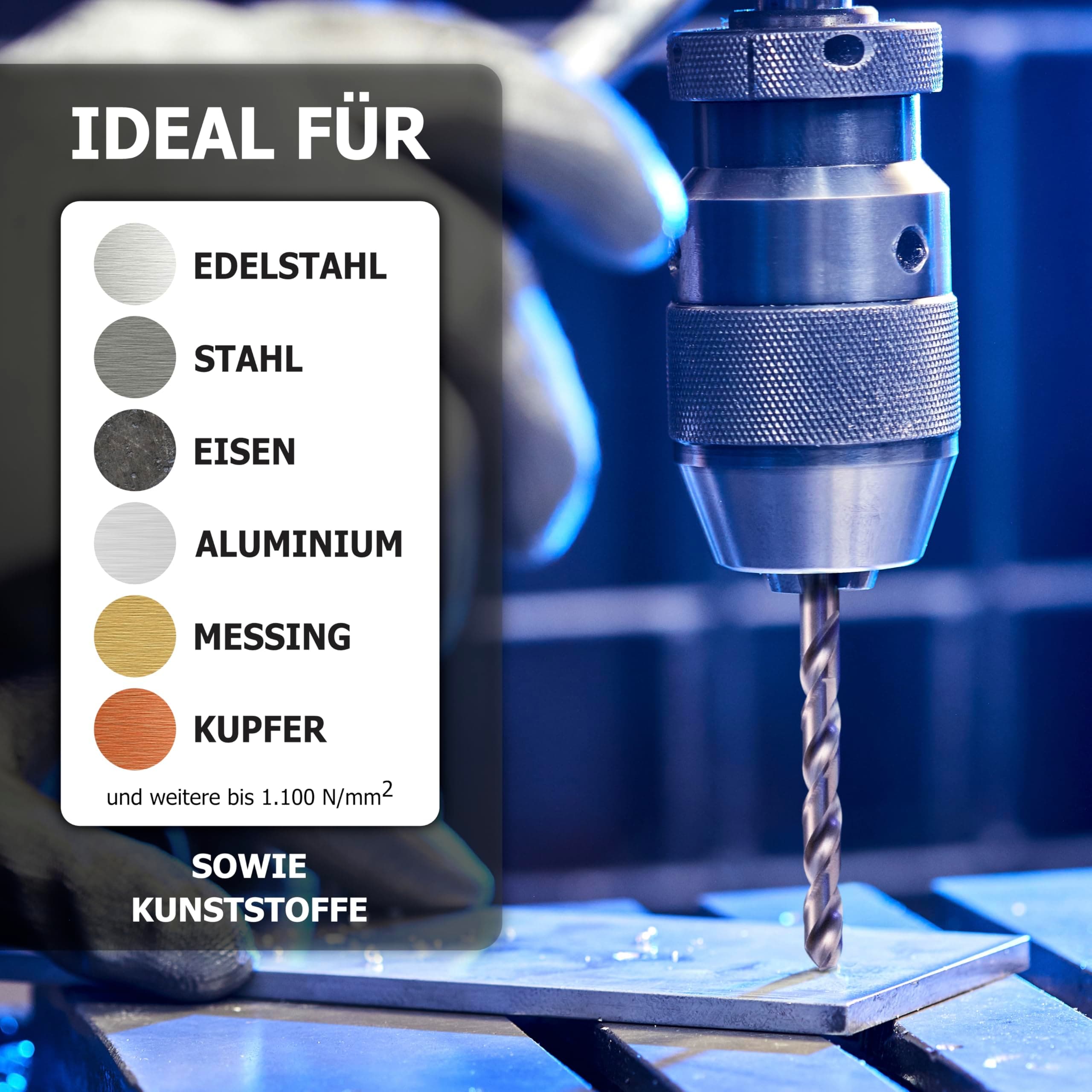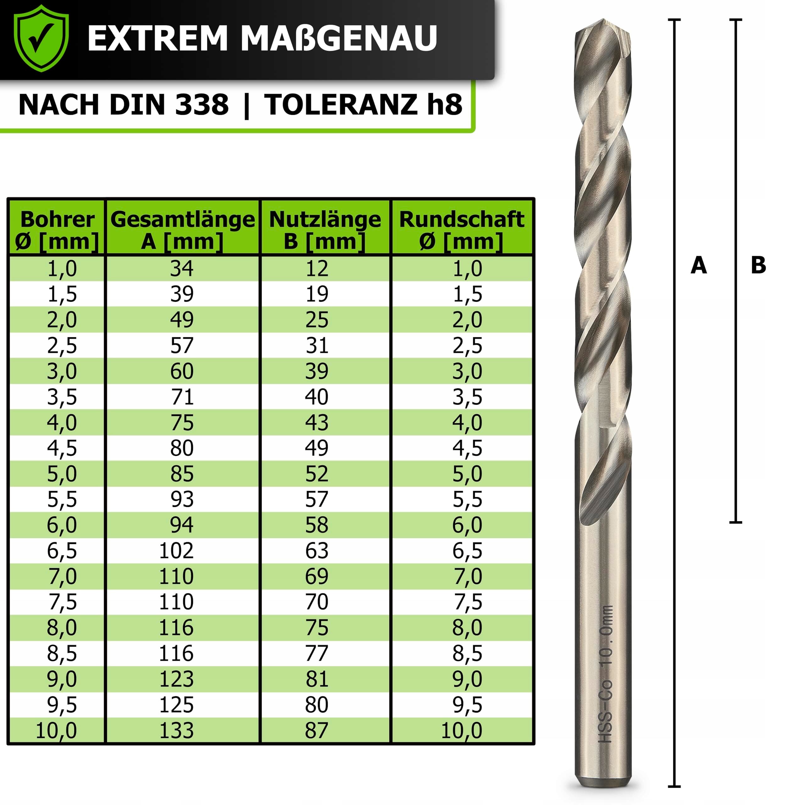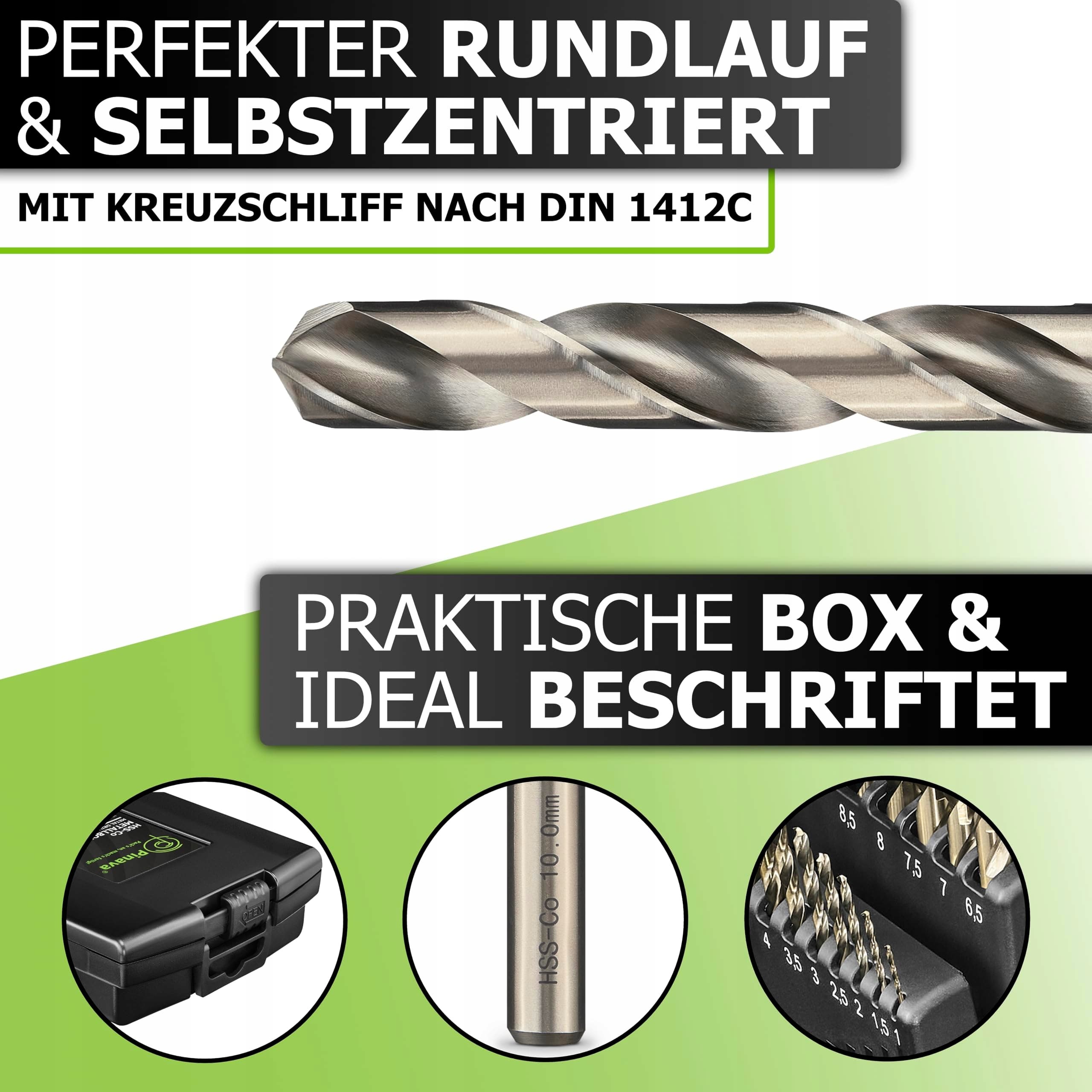 ✅PREMIUM LEGURA KOBALTOWA - Jakość przemysłowa: zestaw wierteł ze stali nierdzewnej HSS z 5% kobaltu o wysokiej odporności na ciepło i zużycie. Uwaga(!) Zwróć uwagę na niskie obroty + ciągłe smarowanie/chłodzenie!