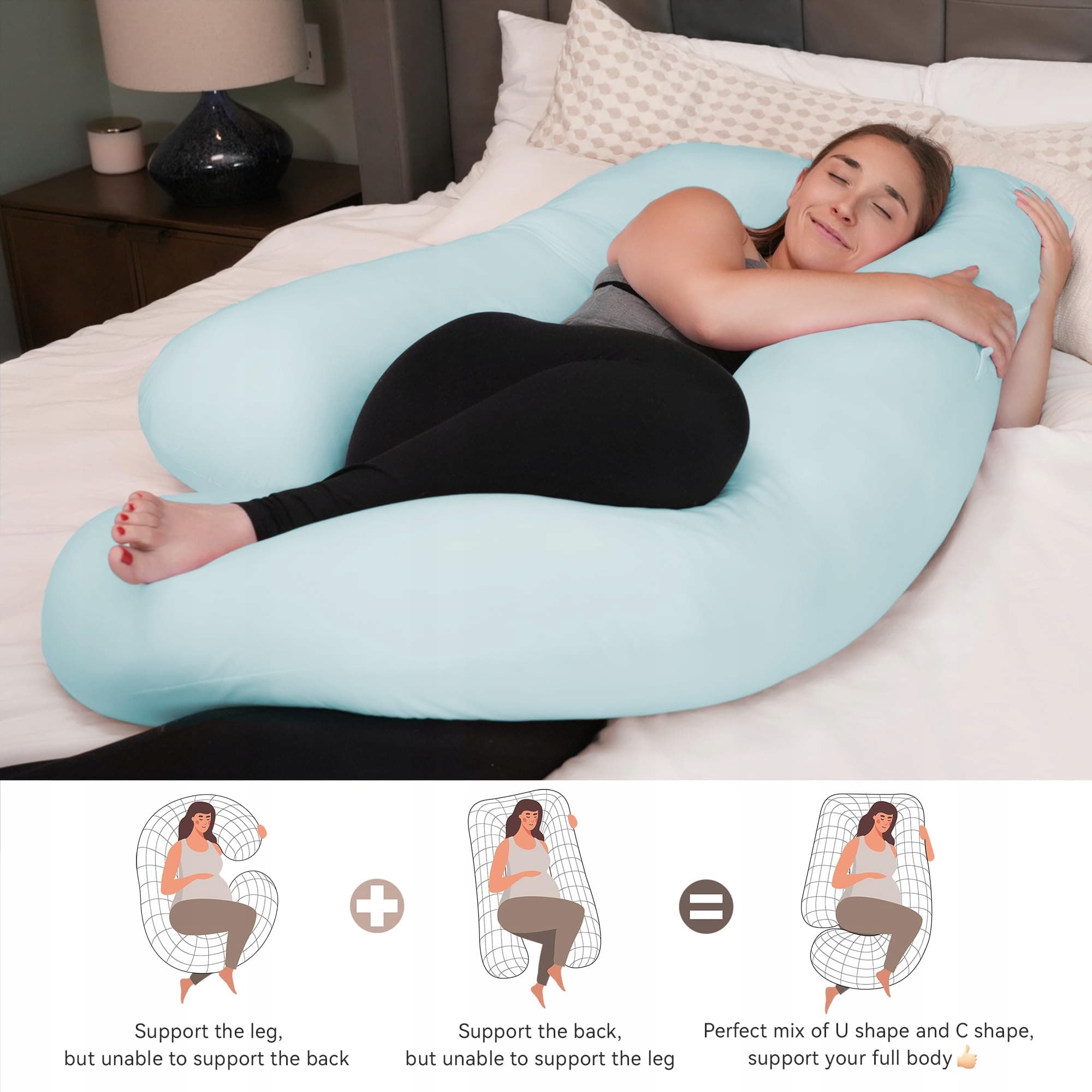 Wsparcie całego ciała i ulga w bólu - Nasza ulepszona poduszka do spania na boku w kształcie litery U łagodzi bóle ciała związane z ciążą i pozwala lepiej spać. Przytula całe twoje ciało i doskonale wspiera głowę, plecy, brzuch, plecy i biodra.