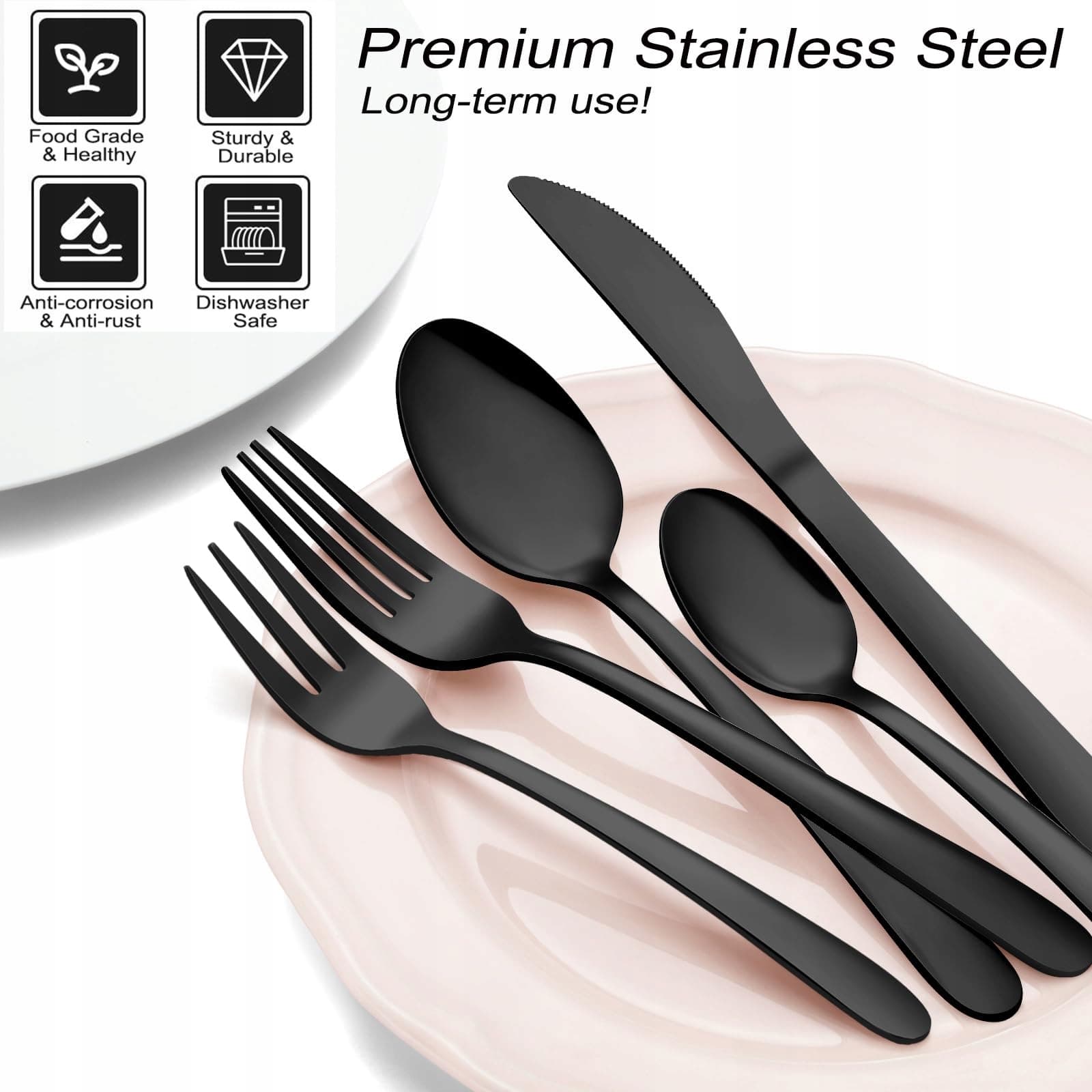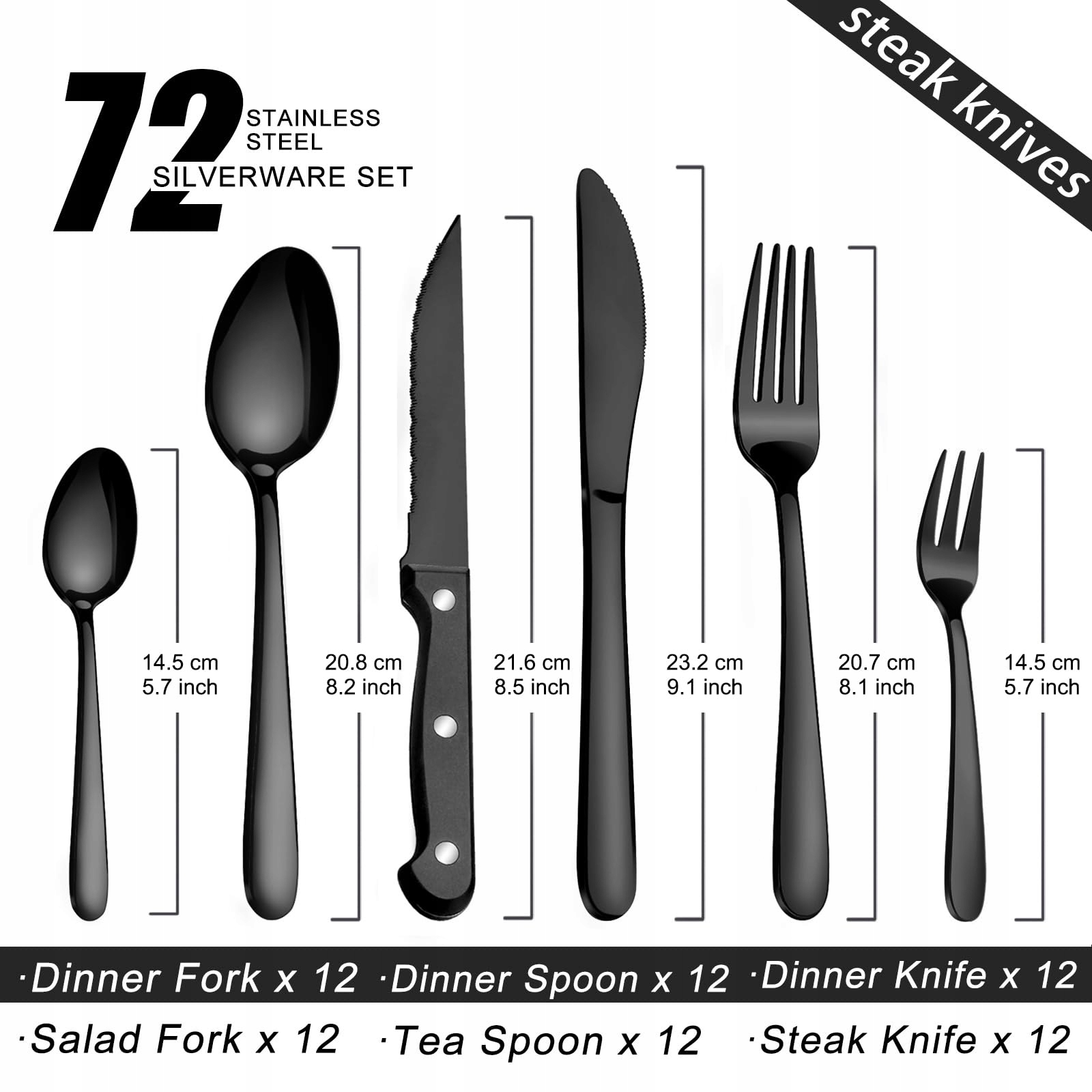 【72-częściowy zestaw sztućców dla 12 osób】Nasz 72-częściowy matowy czarny zestaw sztućców zawiera 12 łyżek stołowych, 12 łyżeczek, 12 widelców obiadowych, 12 widelców do sałatek, 12 noży obiadowych oraz 12 dodatkowych noży do steków, dzięki czemu nie musisz kupować noży do steków osobno. Zestaw sztućców jest również niezastąpionym narzędziem do codziennego użytku lub przygotowywania kolacji czy przyjęć.