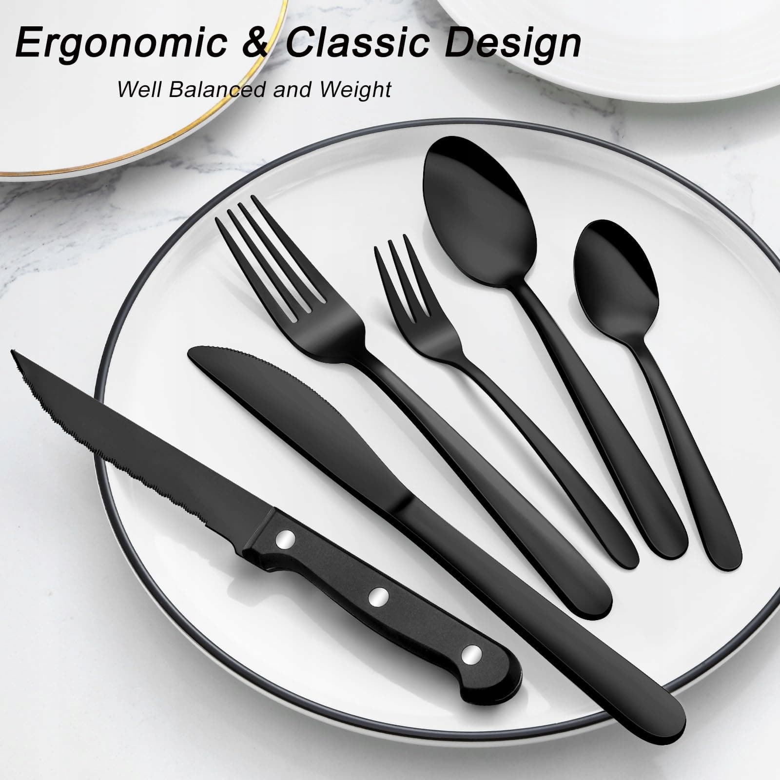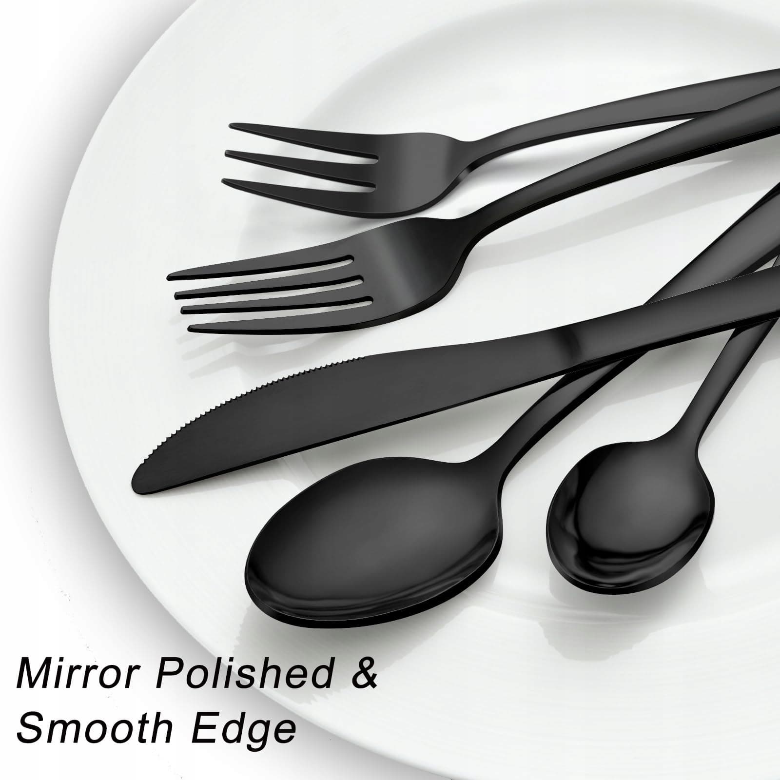 【Wyjątkowe wykonanie i polerowanie na wysoki połysk】Nasz zestaw widelców, łyżek i noży kuchennych jest polerowany na wysoki połysk, co sprawia, że czarny zestaw sztućców wygląda błyszcząco i ma gładkie krawędzie, które nie ranią ust podczas używania. Nasz zestaw widelców, noży i łyżek ma prosty, nowoczesny i elegancki design, z finezyjnymi liniami, idealnie ukształtowany i o odpowiednim rozmiarze, co pozwala na klasyczne połączenia z Twoimi istniejącymi sztućcami, aby codzienne posiłki zamienić w wykwintne doświadczenie kulinarne.