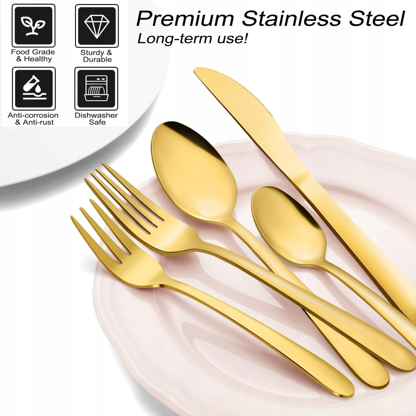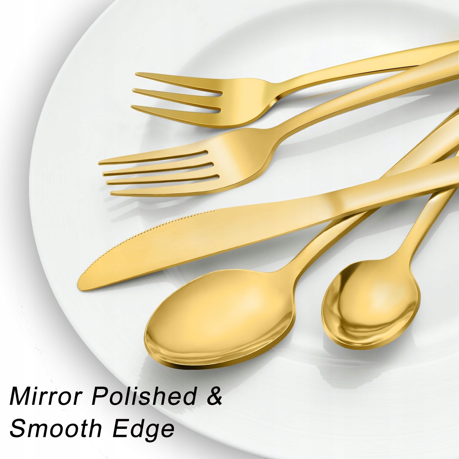 【Wyrafinowane wykonanie i polerowanie na wysoki połysk】Nasz zestaw widelców, łyżek i noży kuchennych jest polerowany na wysoki połysk, co sprawia, że złoty zestaw sztućców wygląda błyszcząco, a krawędzie są gładkie, nie raniąc ust podczas używania. Nasz design widelców, noży i łyżek jest prosty, nowoczesny i elegancki, z wdzięcznymi liniami, idealnie uformowany i o rozmiarze, który umożliwia klasyczne dopasowanie i mieszanie z Twoimi istniejącymi sztućcami, aby codzienne posiłki zamienić w wykwintne doświadczenie kulinarne.