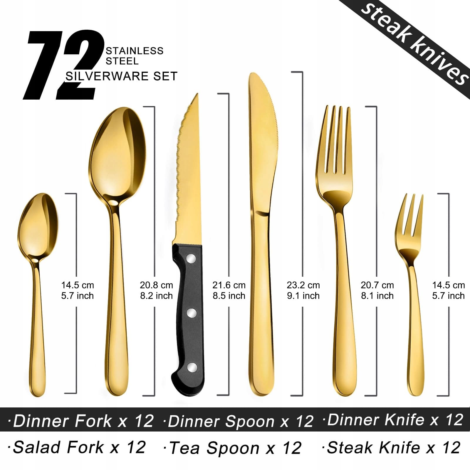 【72-częściowy zestaw sztućców dla 12 osób】Nasz 72-częściowy złoty zestaw sztućców zawiera 12 łyżek stołowych, 12 łyżeczek, 12 widelców obiadowych, 12 widelców do sałatek, 12 noży obiadowych oraz 12 dodatkowych noży do steków, dzięki czemu nie musisz kupować noży do steków osobno. Zestaw sztućców jest również niezastąpionym narzędziem do jedzenia, zarówno do codziennego użytku, jak i do przygotowywania kolacji czy imprez.