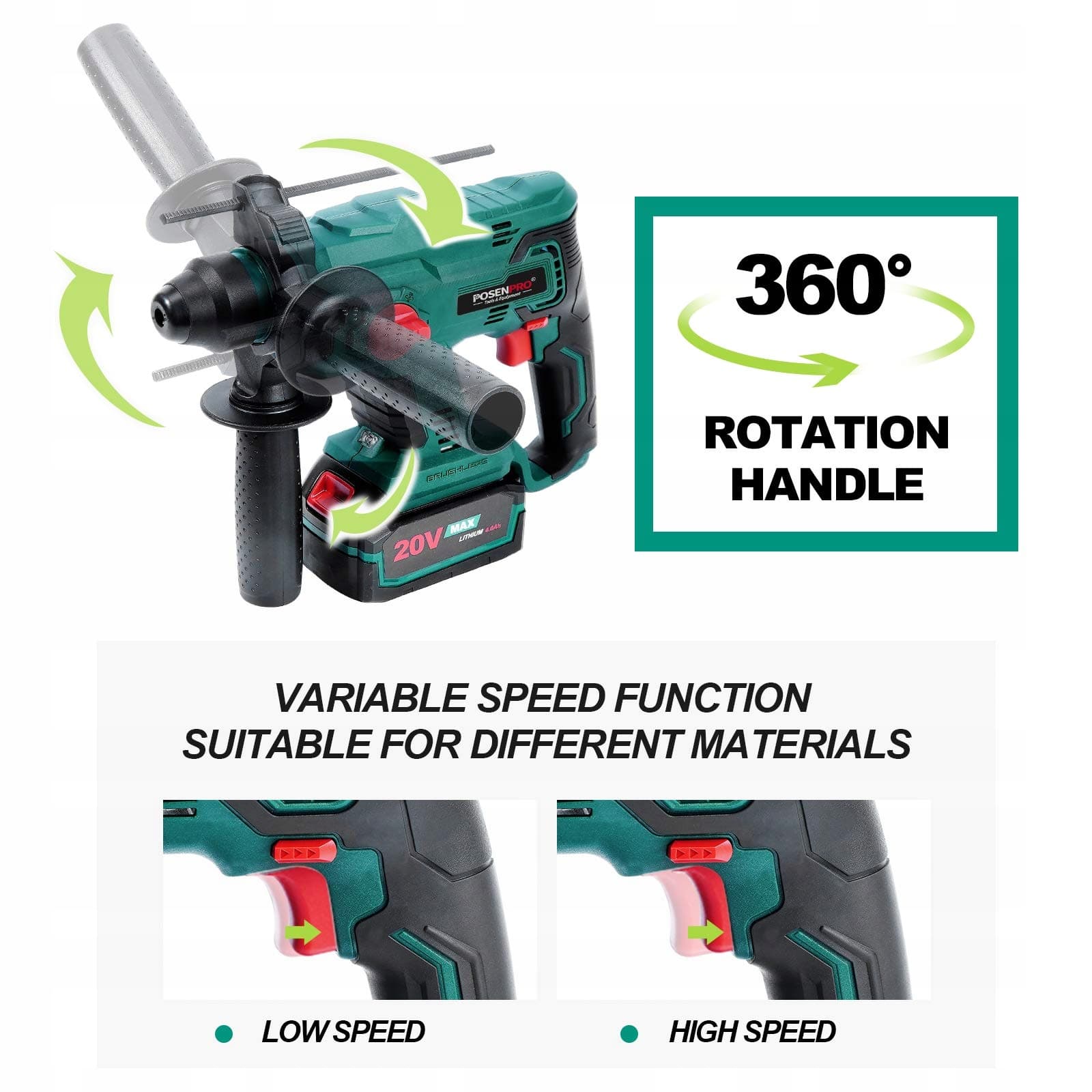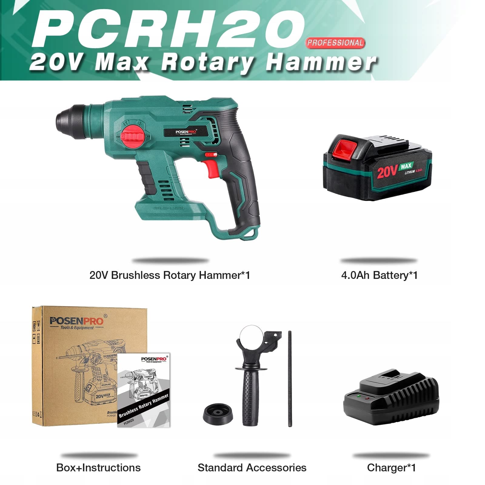 💪【Wydłużony czas pracy】Młotowiertarka akumulatorowa POSENPRO PCRH20 zawiera akumulator o dużej pojemności 4,0Ah z ochroną ogniw przed przeciążeniem, nadmiernym rozładowaniem i przegrzaniem. Bez uciążliwych kabli zapewnia nieograniczoną swobodę ruchu. Wysokowydajny akumulator zapewnia ogromną moc i maksymalny czas pracy.