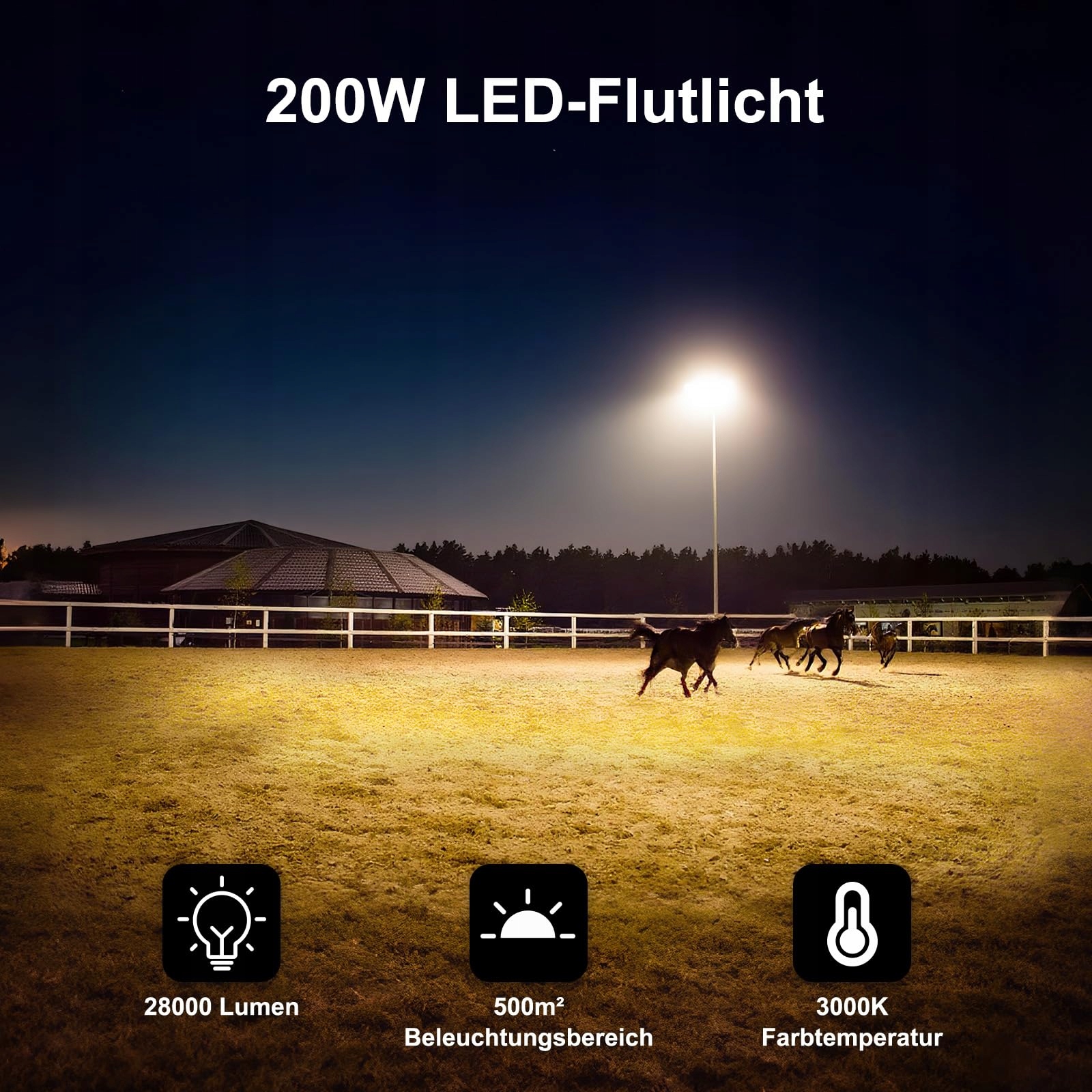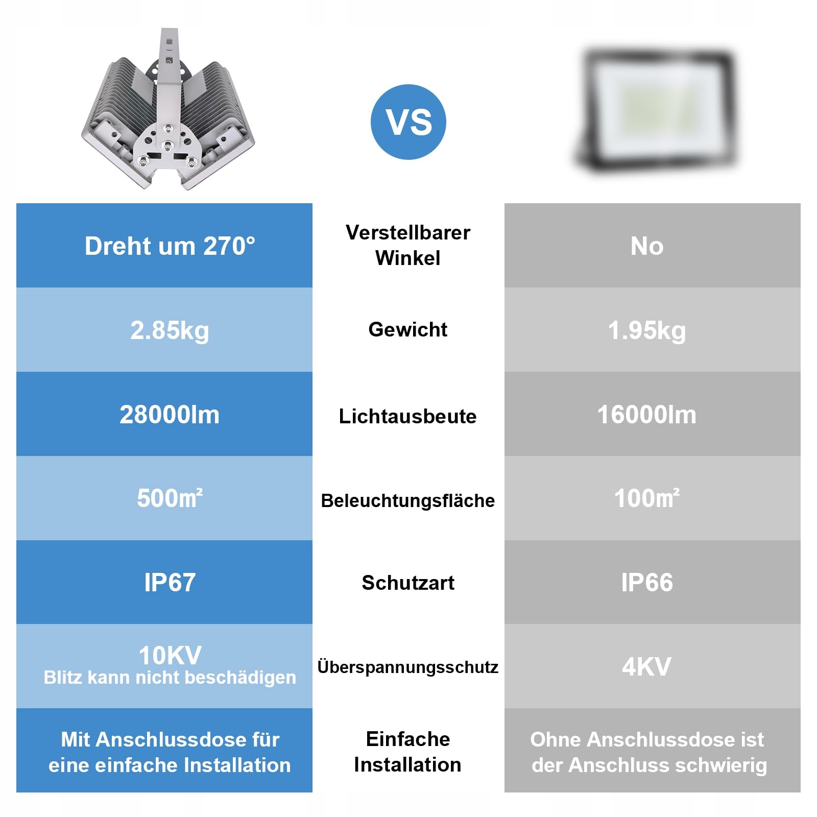 Szerszy obszar oświetlenia: LED floodlight zewnętrzny dostarcza do 28 000 LM i oferuje wyższą jasność niż tradycyjne halogeny 4000W. Reflektor zewnętrzny równomiernie oświetla powierzchnię 480 m² bez ciemnych miejsc
