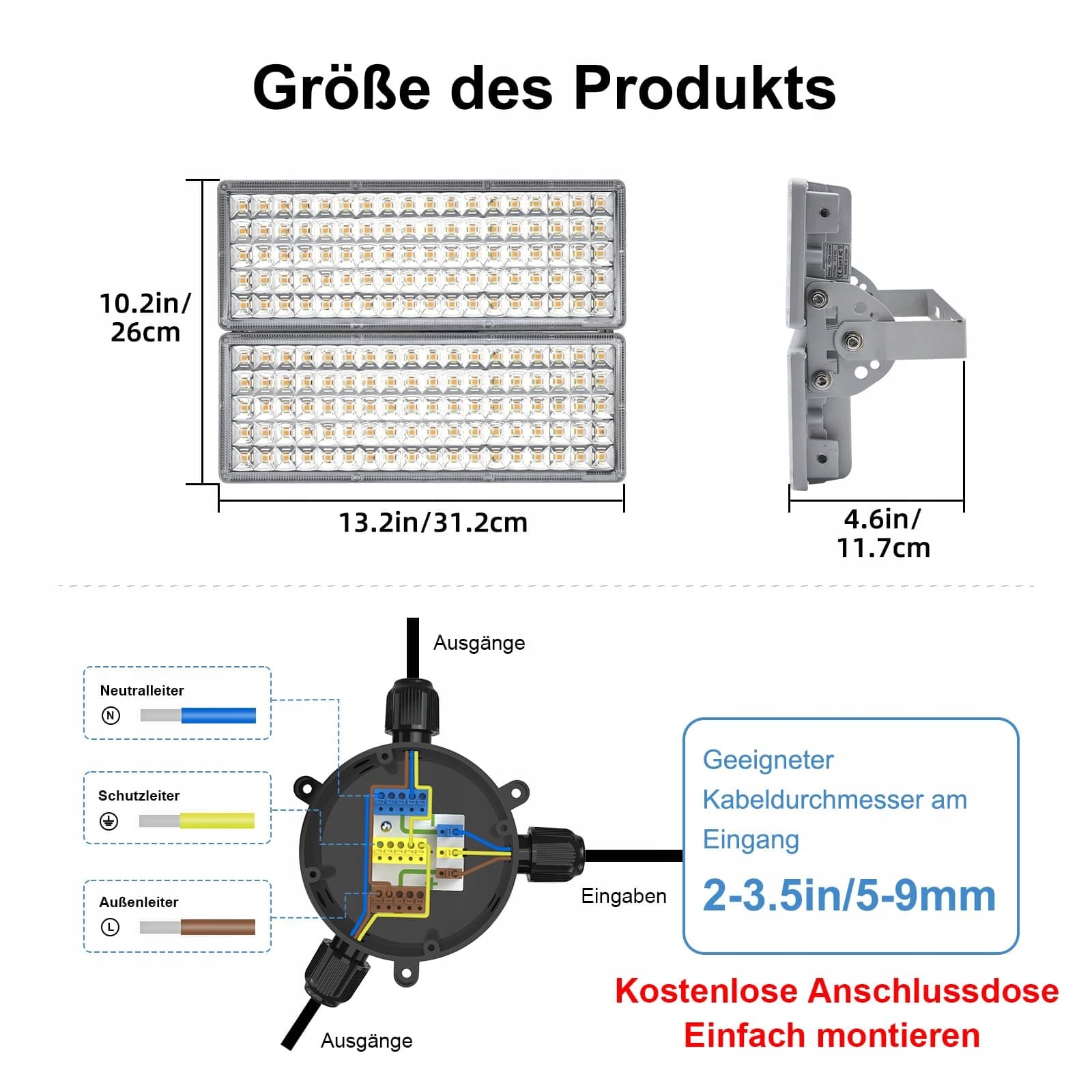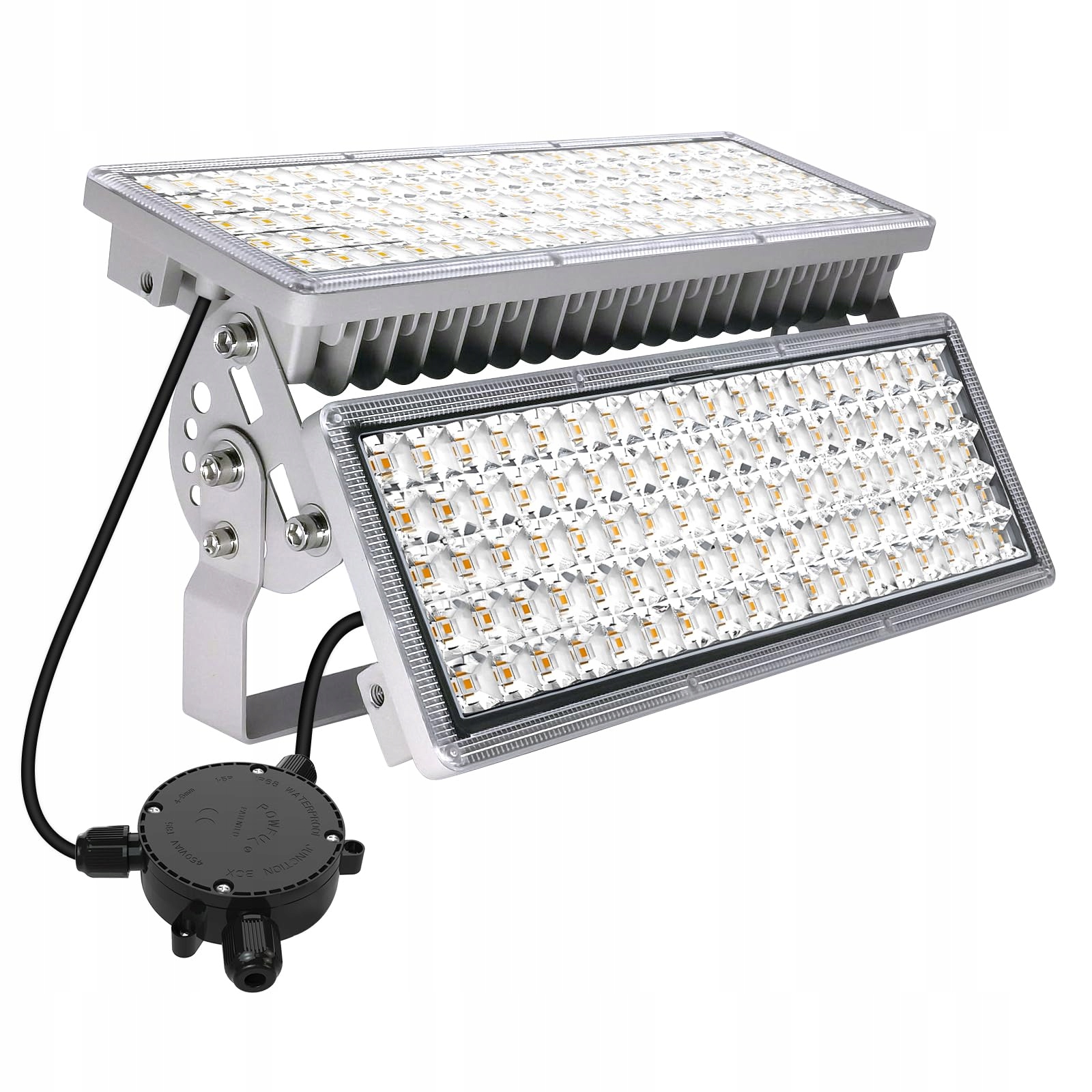 Elastyczny montaż: reflektor na podwórko jest dostarczany z kablem zasilającym o długości 0,5 metra oraz uchwytem w kształcie litery U, który można ustawić pod dowolnym kątem. Dzięki temu produkt nadaje się do różnych zastosowań, takich jak stadiony i parkingi. (Brak wtyczki! Brak czujnika! Brak panelu słonecznego! Brak pilota!)