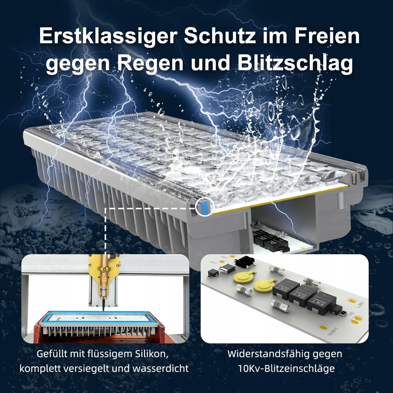 Konstrukcja z aluminium lotniczego: reflektor LED floodlight wykonany jest z grubego, lotniczego odlewu ciśnieniowego aluminium i posiada solidną oraz trwałą obudowę. Soczewka reflektora zewnętrznego wykonana jest z odpornego na uderzenia materiału PC, który wytrzymuje silne burze, grad lub inne czynniki zewnętrzne. Klasa ochrony IP67 zapewnia, że led floodlight na boisko działa niezawodnie w trudnych warunkach, takich jak deszcz, śnieg czy kurz