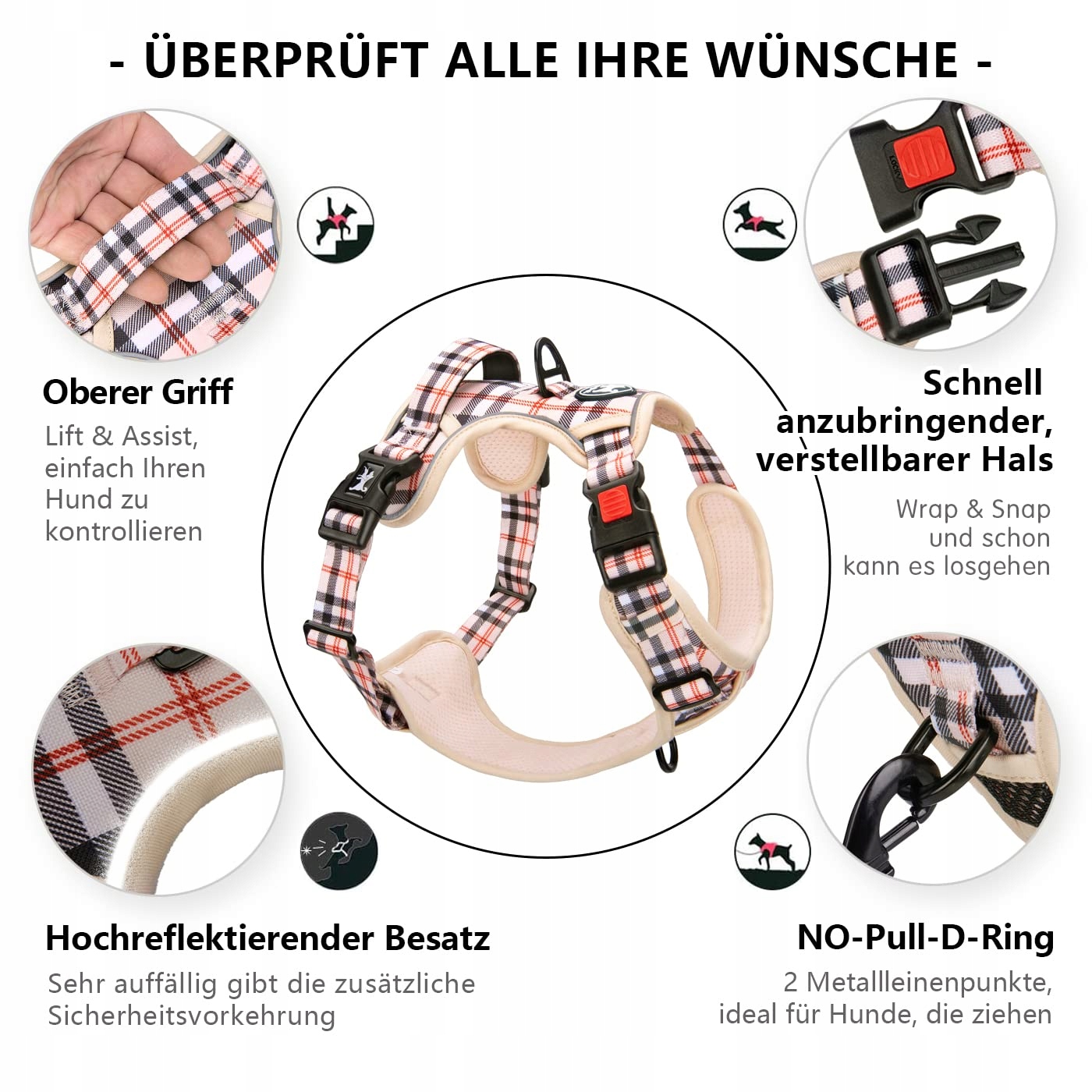 PoyPet Keine Pull Hundegeschirr Front Reflektierende Pet Weste für Hunde mit Einfache Kontrolle Griff und Rückseite perfekt für den täglichen Training, Walken, Running(Kariertes Beige,L)