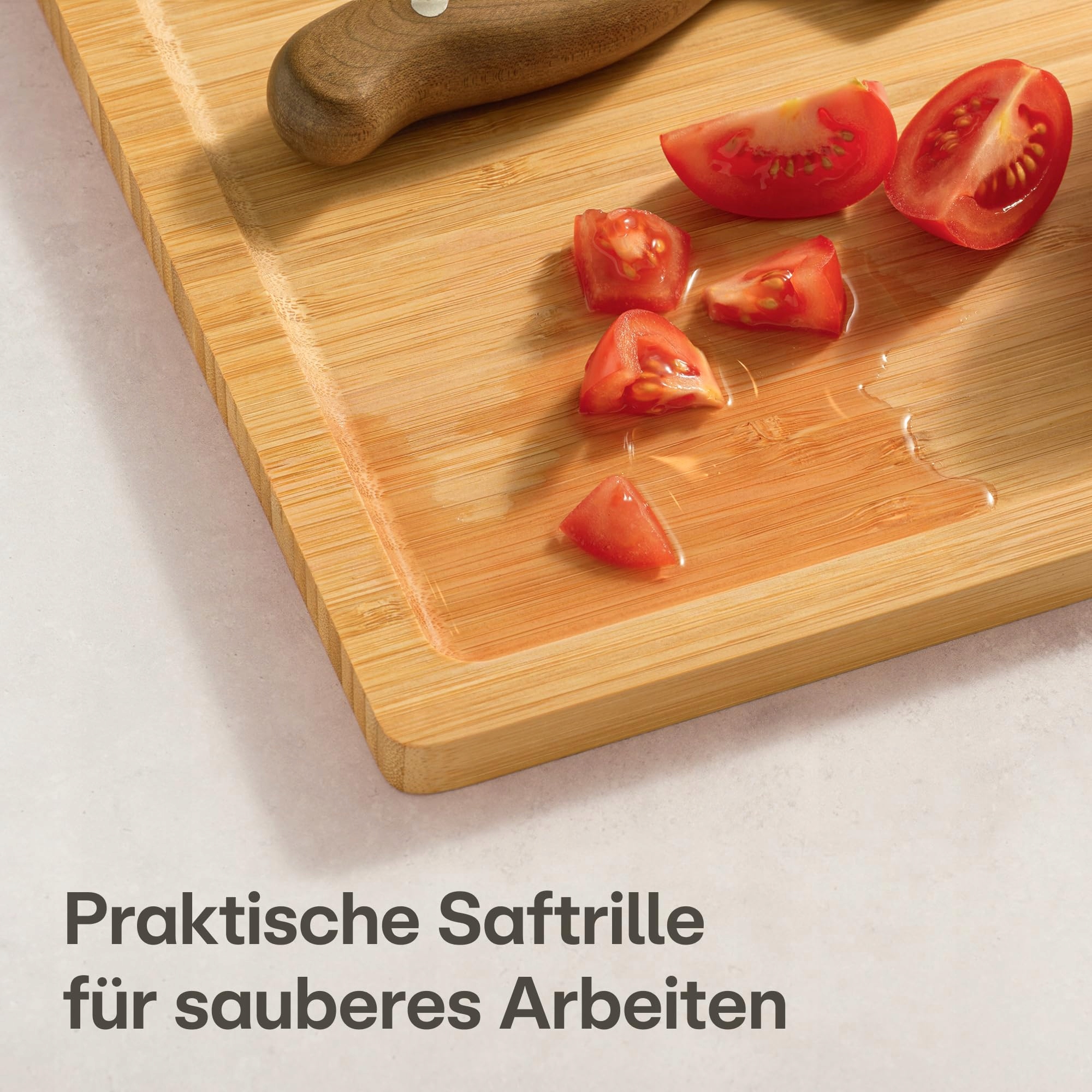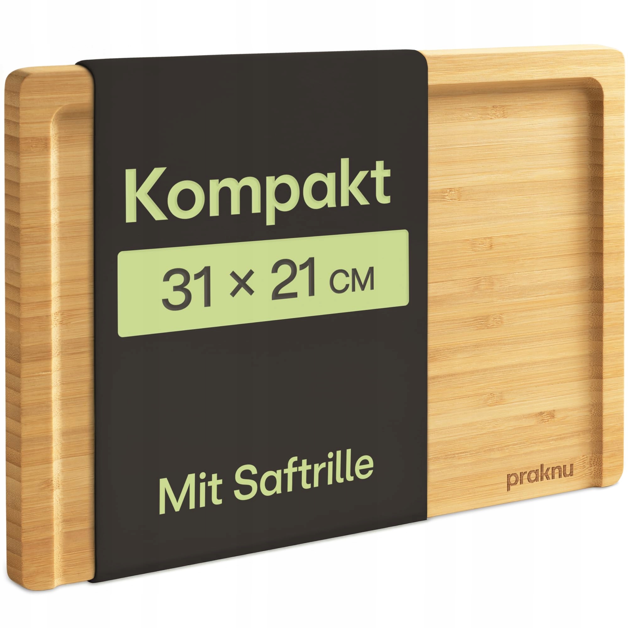Deska do krojenia Praknu z drewna – Kompaktowa 31,5 x 21,5 cm – Z rowkiem na sok i płaską stroną – FSC® bambusowa deska kuchenne dla warzyw, mięsa i serwowania – Oszczędzająca miejsce i praktyczna