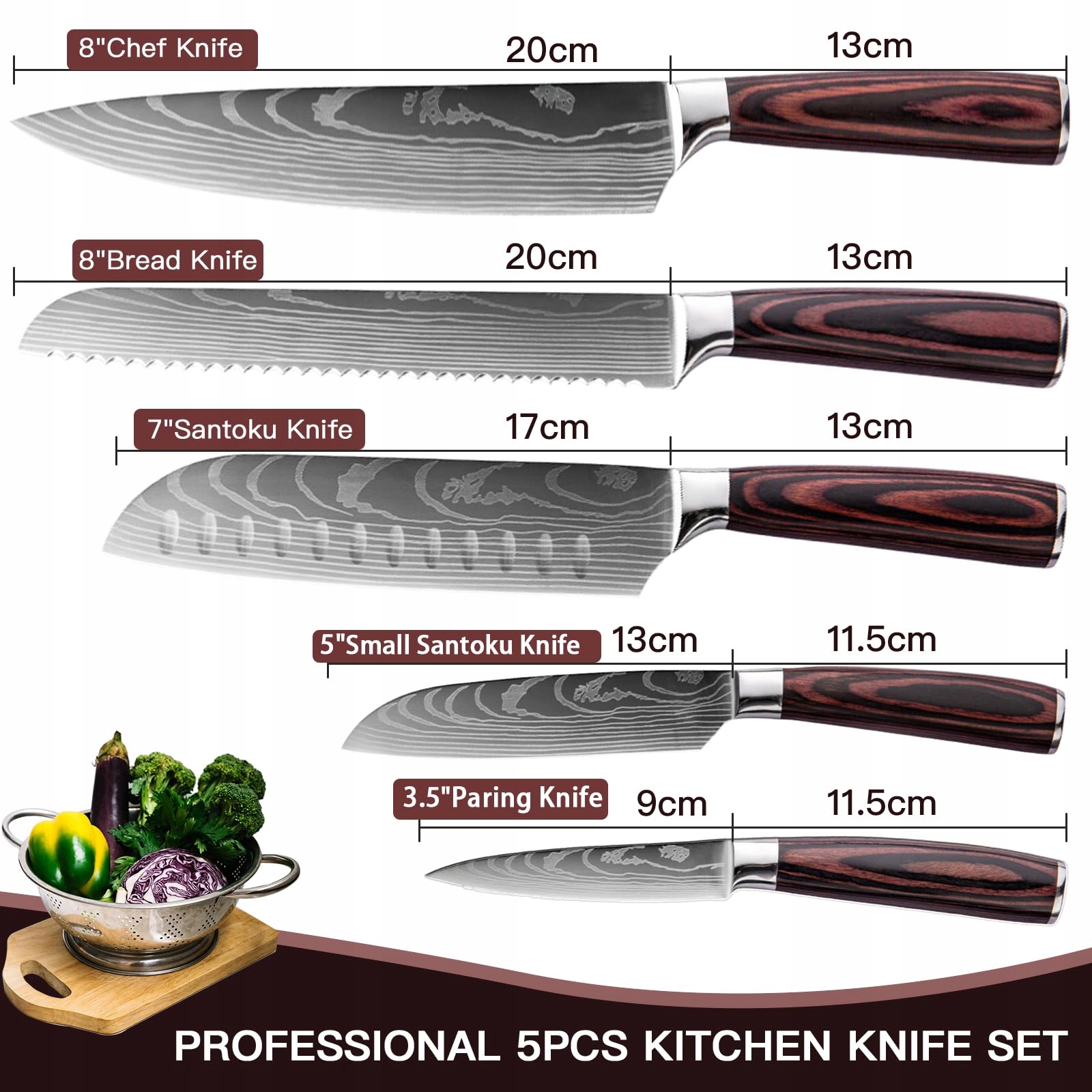☆ Wszechstronny zestaw noży kuchennych – Ten zestaw noży do kuchni obejmuje 1x nóż do obierania 3", 1x nóż uniwersalny 5", 1x nóż Santoku 7", 1x nóż do chleba 8" i 1x nóż kuchenny 8". Profesjonalny zestaw noży kuchennych z różnymi funkcjami, który bez trudu radzi sobie z codziennymi zadaniami kuchennymi, takimi jak krojenie, siekanie, cięcie, rozdrabnianie mięsa, owoców, warzyw i nie tylko. Idealny wybór zarówno dla amatorów, jak i profesjonalistów.