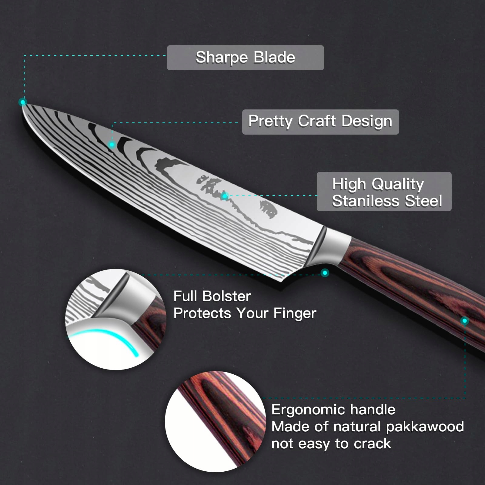 Zestaw noży 5-częściowy, zestaw noży kuchennych z wysokiej jakości stali nierdzewnej, premium zestaw noży kuchennych z ergonomicznym drewnianym uchwytem, ostry zestaw noży i profesjonalne noże kuchenne, nóż uniwersalny, zestaw noży kuchennych w eleganckim opakowaniu
