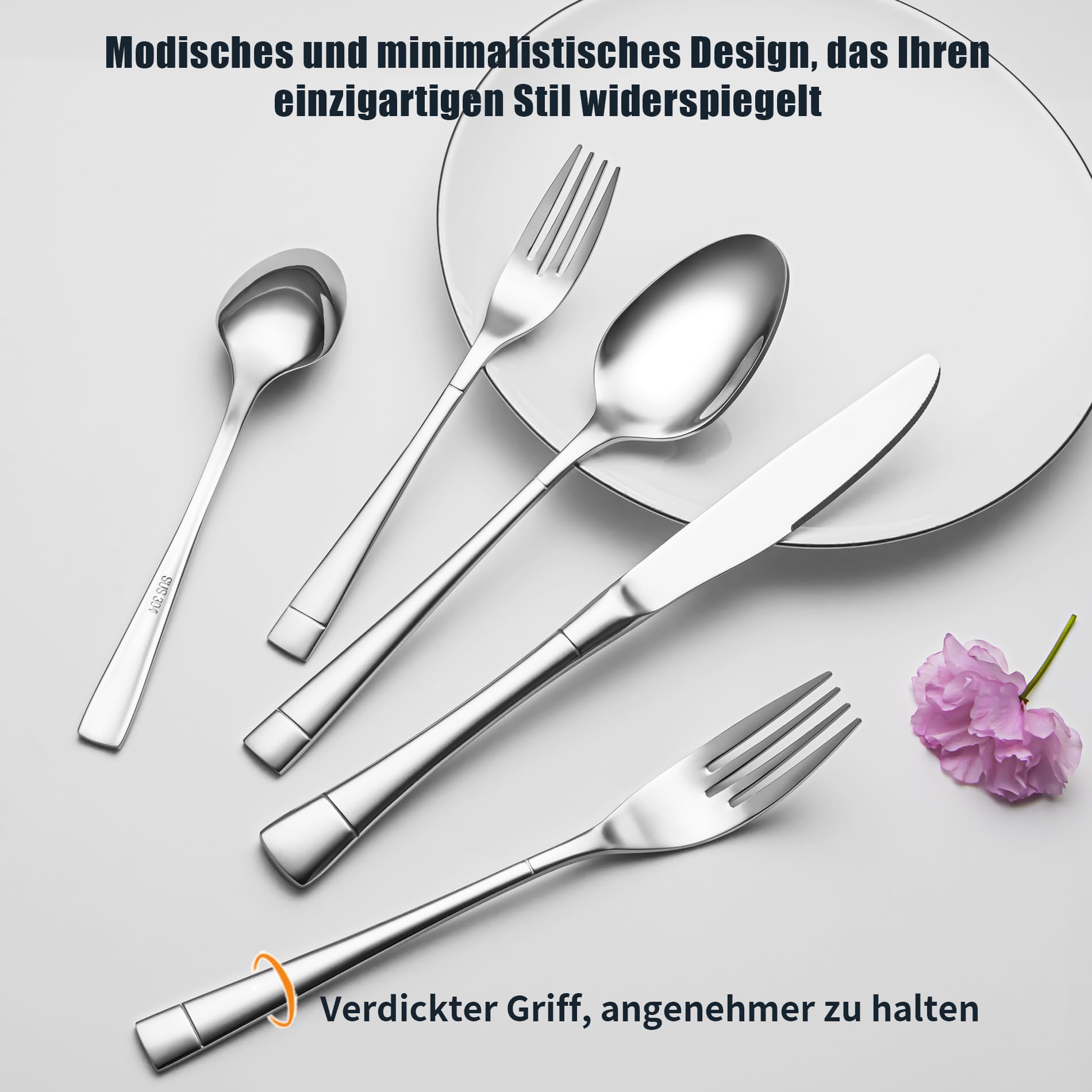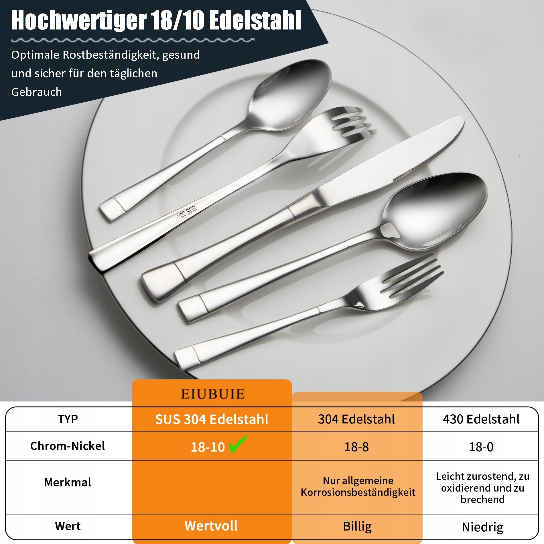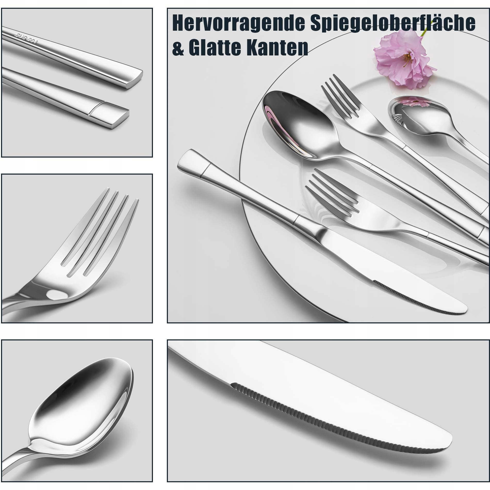 【Nowoczesny zestaw sztućców z eleganckim designem】Nowoczesny zestaw sztućców EIUBUIE dla 6 osób wyróżnia się zwięzłymi uchwytami z wyraźnymi liniami i kanciastym zakończeniem. Ten zestaw sztućców w nowoczesnym stylu artystycznym pasuje do każdej zastawy stołowej, sprawia, że każdy posiłek staje się bankietem na wysokim poziomie i tworzy przyjemną atmosferę podczas jedzenia. Gruby uchwyt zapewnia wygodny chwyt i ciężkie odczucie w dłoni. Wysokiej jakości zestaw sztućców kuchennych pozwala lepiej cieszyć się jedzeniem