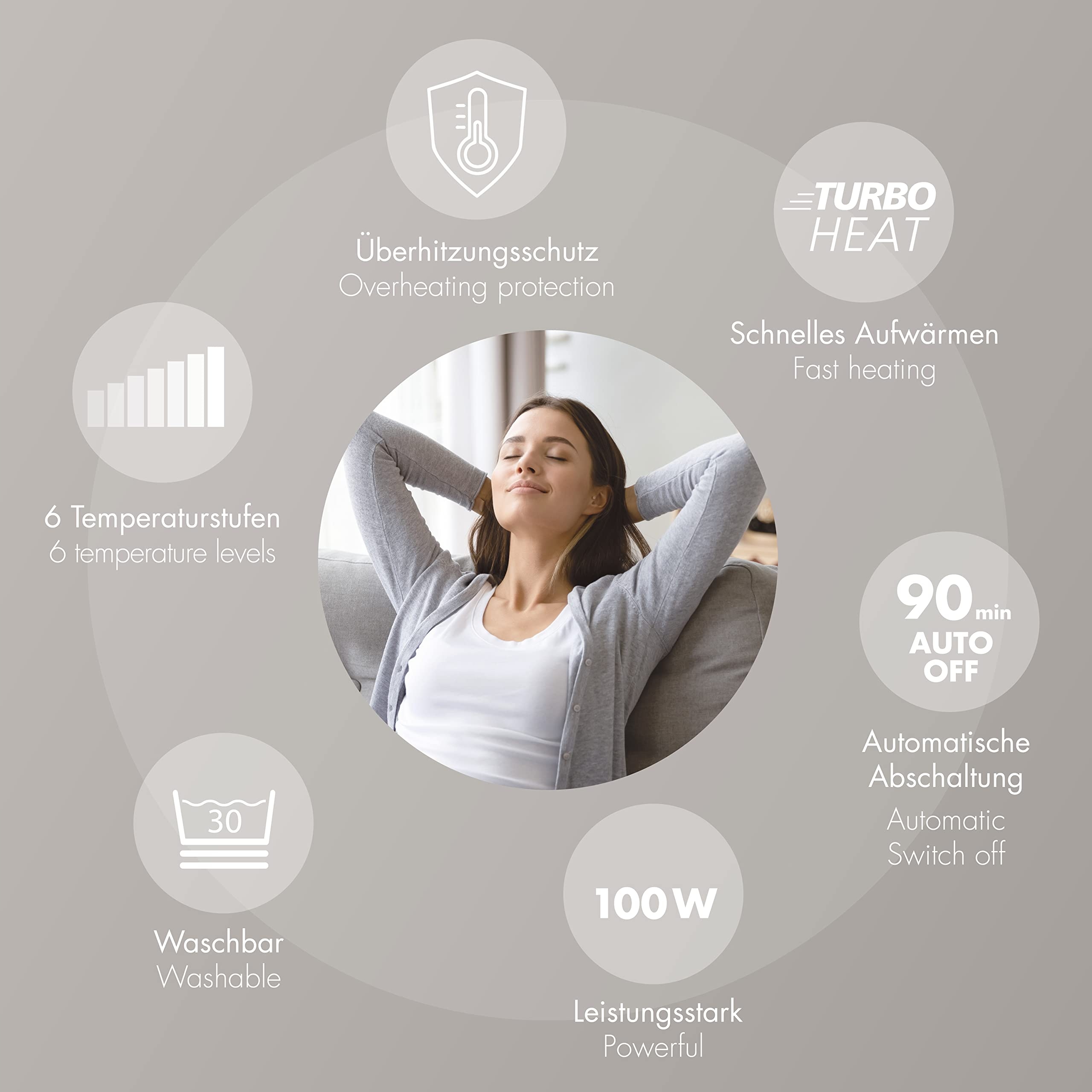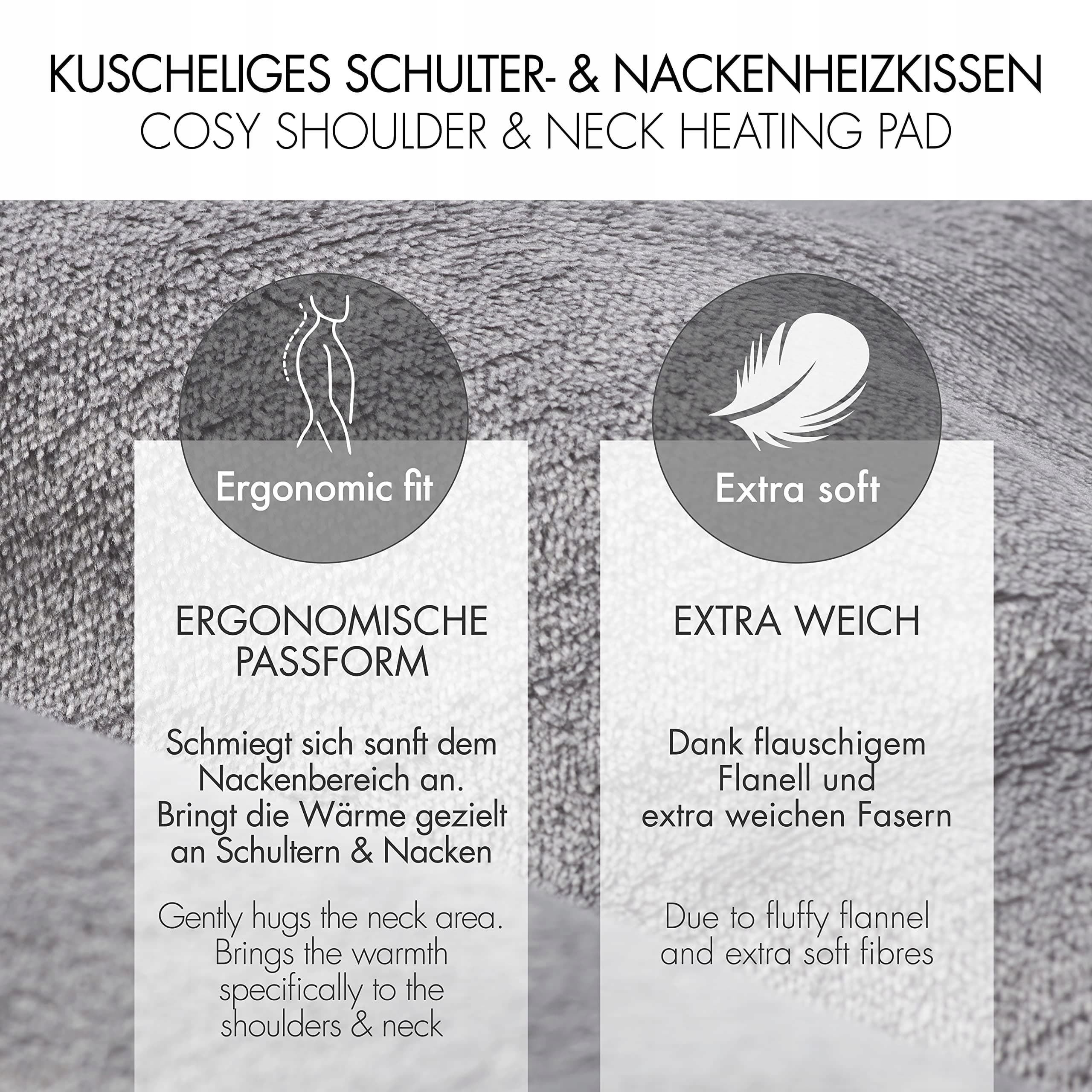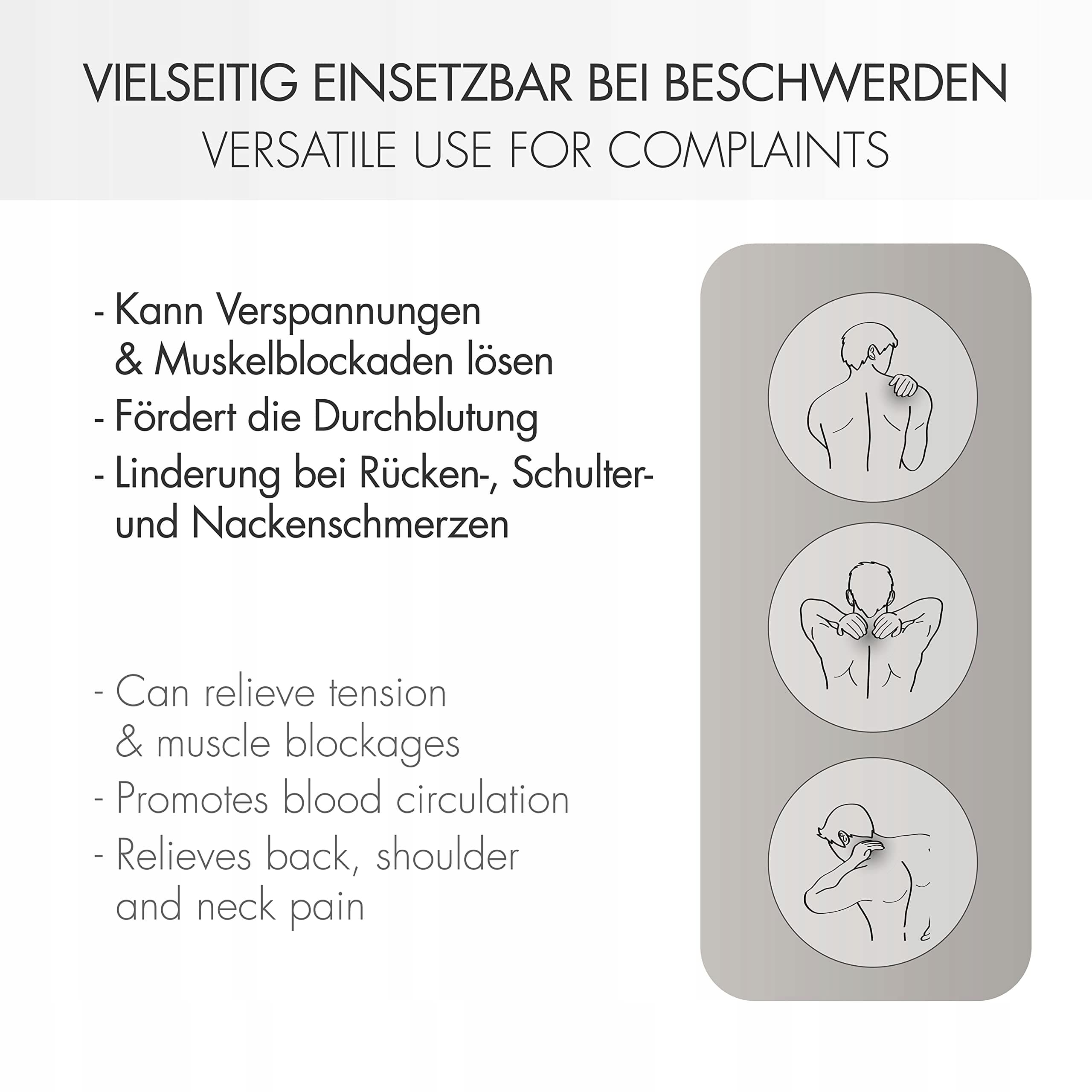 [Łatwa obsługa] Łagodzenie napięć w szyi, ramionach i górnej części pleców. Nasza poduszka grzewcza ogrzewa aż do obszaru szyi i oferuje szczególnie łatwą obsługę z ergonomicznym przełącznikiem. Materiał 100% poliester, rozmiar ok. 52 x 56 cm, moc 100 watów.