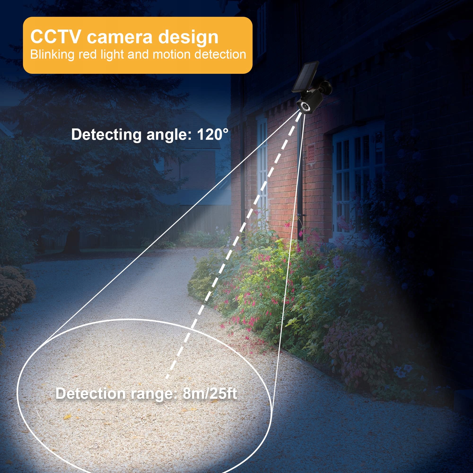 ATRAPA KAMERY NA ZEWNĄTRZ: Wysokoczuły czujnik ruchu do naszej atrapy kamery wideo na zewnątrz. Trzy tryby pracy: przyciemniony, zimowy i jasny. Czujnik PIR o kącie wykrywania 130° i zasięgu do 26ft/8m. Automatyczne wyłączanie po 25-30 sekundach