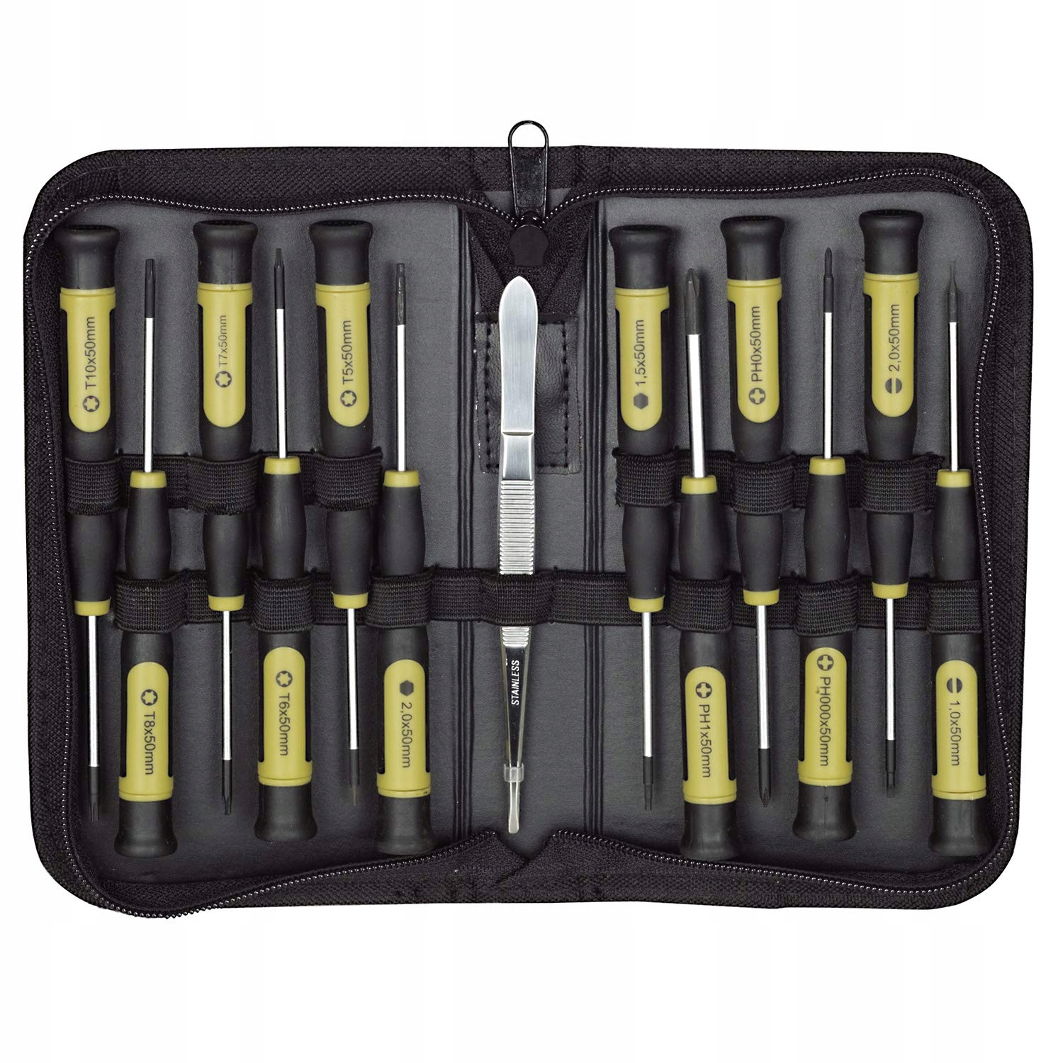 W zestawie znajduje się 12 wkrętaków oraz pęseta do chwytania małych śrub