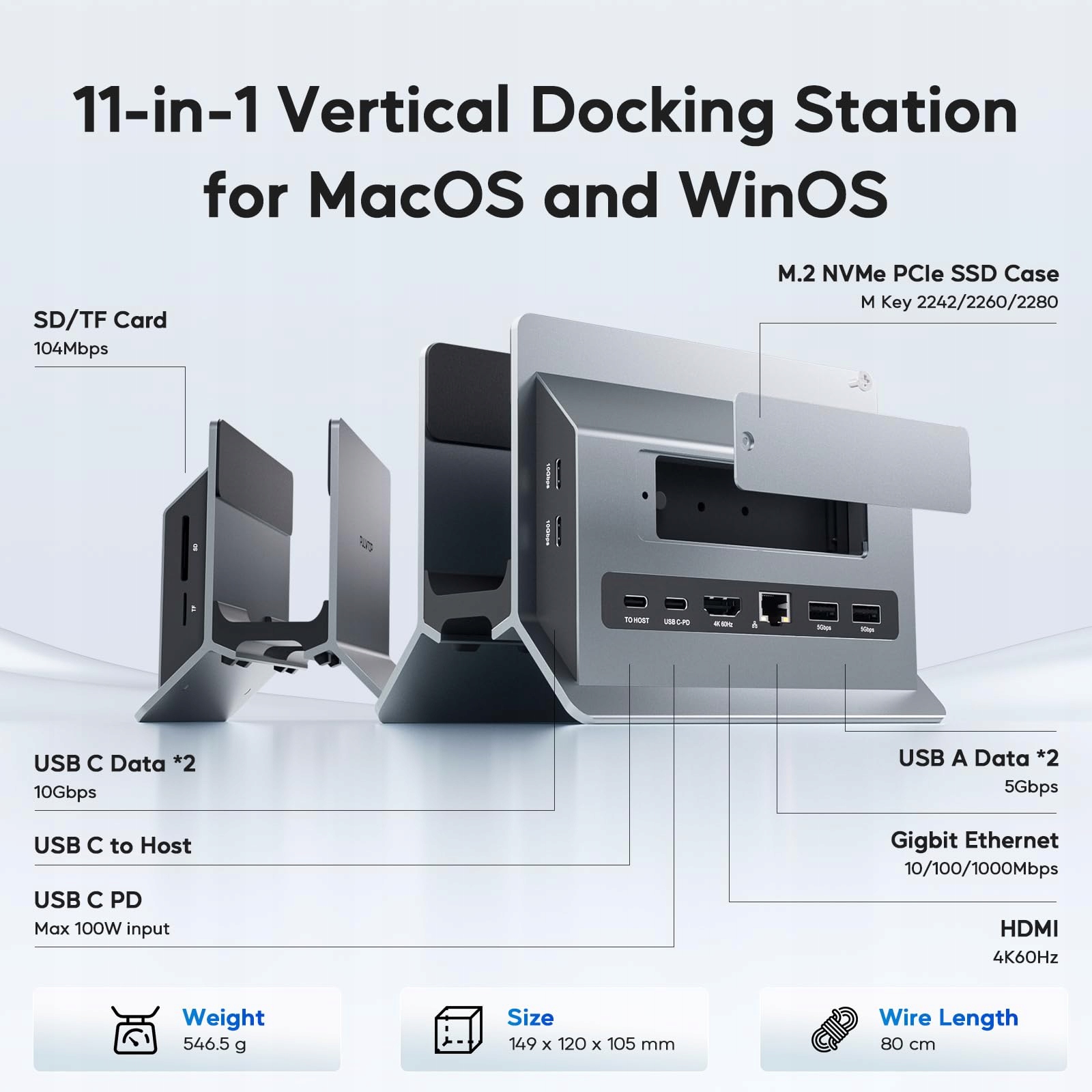 【11-w-1 stacja dokująca do laptopa】: Ta stacja dokująca MacBook dla laptopów USB-C posiada 1 x 4K@60Hz HDMI, 2 x USB C 3.2 GEN2, 2 x USB A 3.1 GEN1, SD/TF, RJ45 przewodowy Gigabit Ethernet, obudowę M.2 NVMe SSD oraz PD 100 W. Uwaga: Proszę upewnić się, że port USB-C w Twoim laptopie obsługuje przesyłanie danych, wideo oraz funkcje ładowania. NIE obsługuje dwóch monitorów.】