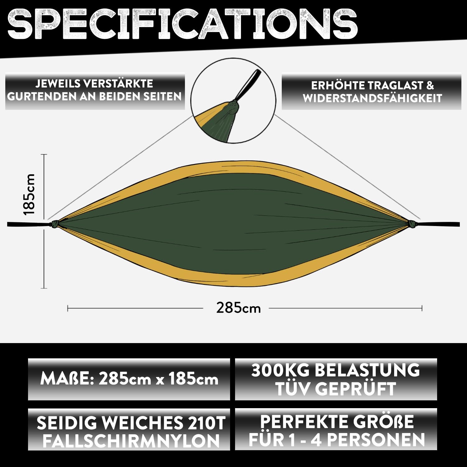 ✅ BEZKOMPROMISOWA JAKOŚĆ: Dodatkowo wzmocniony i unikalny design pasków na końcach hamaków. Potrójnie wzmocnione szwy, wytrzymały i odporny na warunki atmosferyczne nylon spadochronowy. Ekstremalnie stabilne karabinki i innowacyjny, przetestowany system zawieszenia.