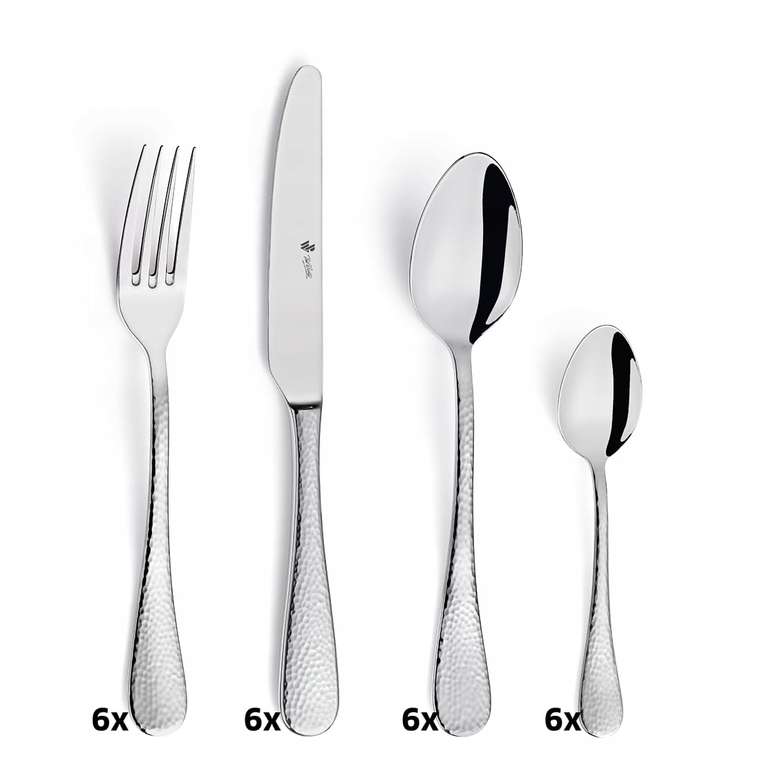 PW Paul Wirths MONDO zestaw sztućców 24-częściowy | 6 noży do menu, 6 widelców do menu, 6 łyżek do menu, 6 łyżeczek do kawy | Sztućce w designie młotkowanym | Stal nierdzewna 18/10 wysoko polerowana | Nadaje się do mycia w zmywarce