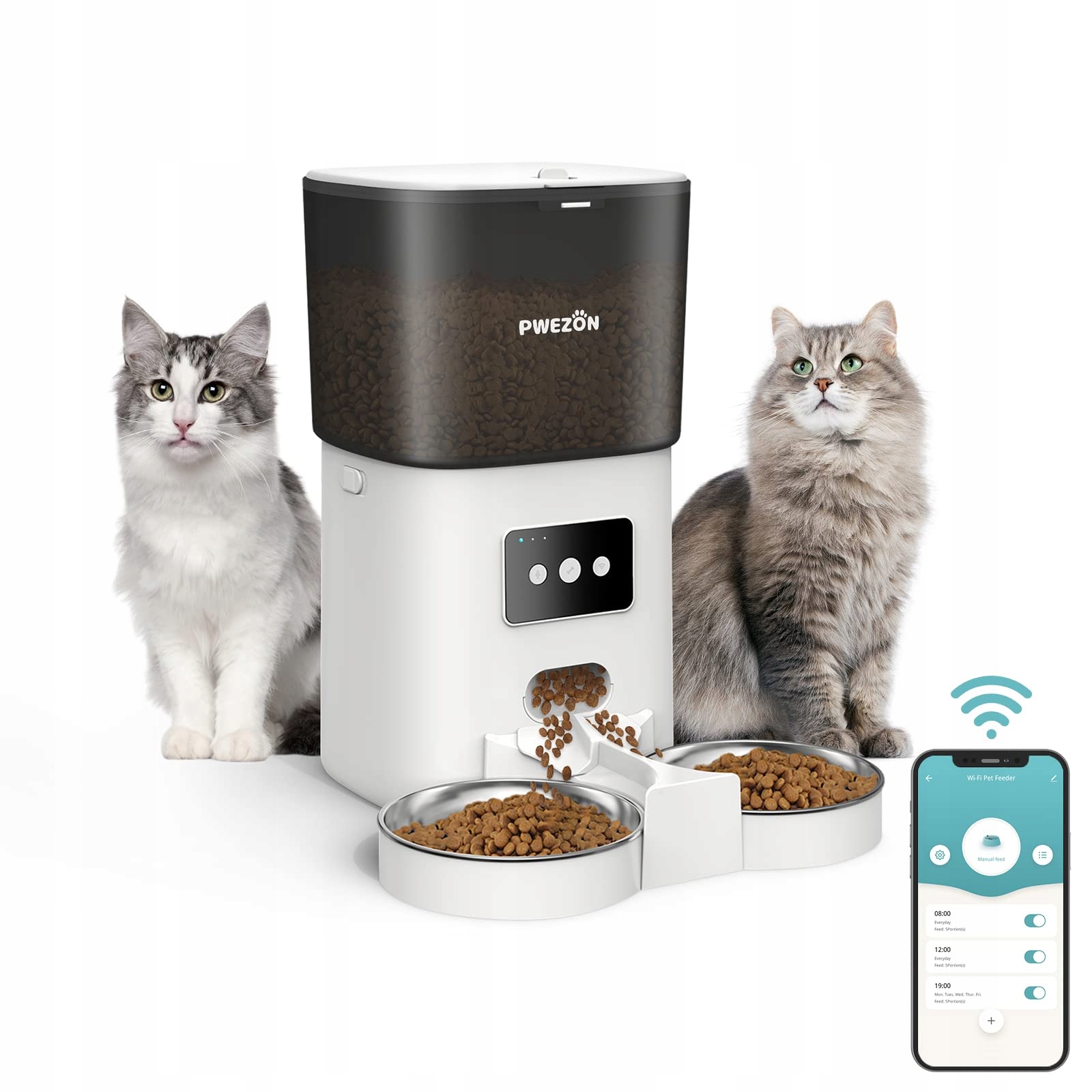 PWEZON Inteligentny WiFi Podwójny Automat do Karmienia dla Dwóch Kotów, automatyczny automat do karmienia kotów z 2 stalowymi miskami, 6L dozownik suchej karmy z aplikacją i timerem dla kota i psa