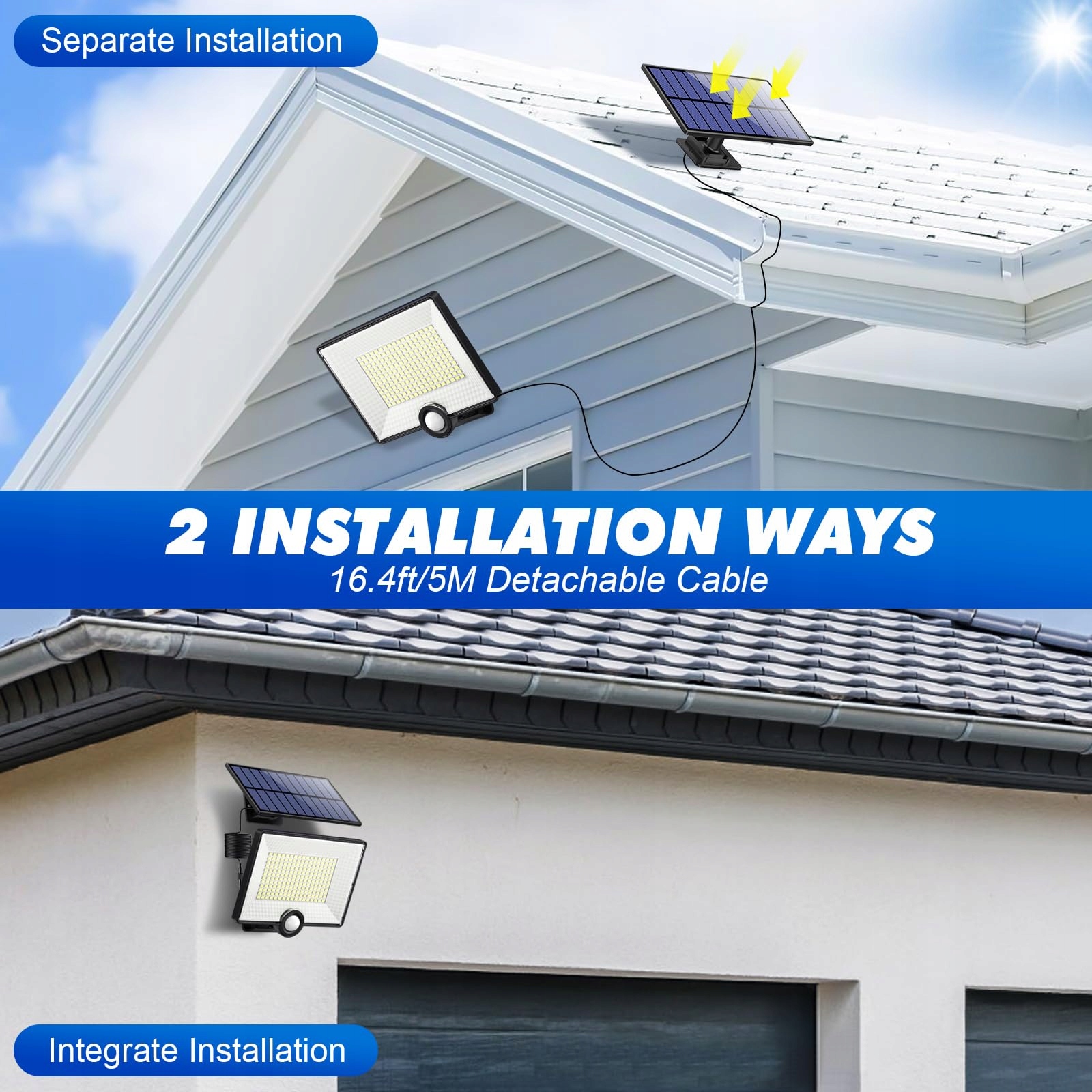 【Podzielony panel solarny lampy solarne na zewnątrz】W porównaniu z tradycyjnymi lampami solarnymi z czujnikiem ruchu oddzieliliśmy panel solarny od głównej części świetlnej. Możesz zainstalować panel solarny za pomocą dołączonego wodoodpornego kabla o długości 5 m w nasłonecznionym miejscu, aby lampa ścienna solarna mogła być efektywnie ładowana.