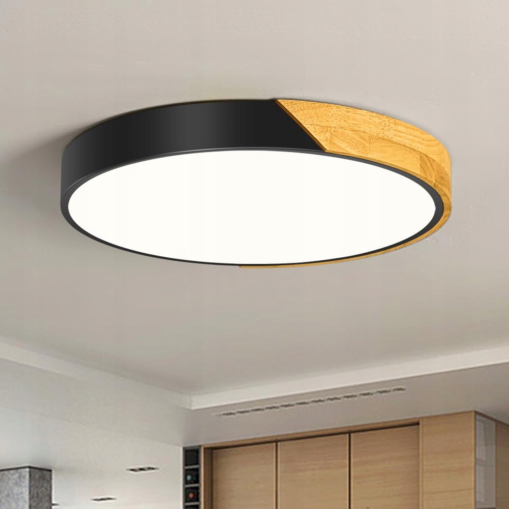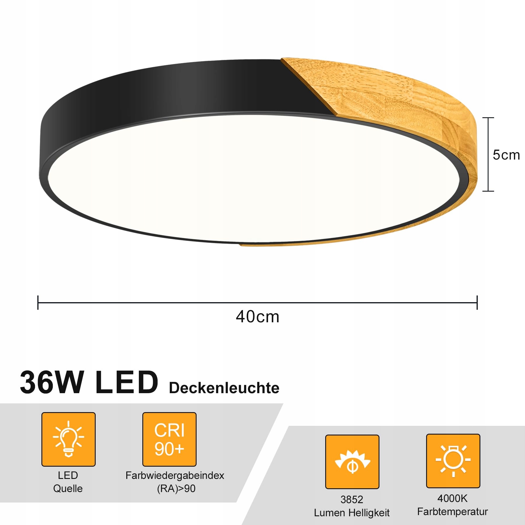 Rozmiar i materiał: Nowoczesna lampa sufitowa LED 4000K ma średnicę 40 cm. Wysokość wynosi 5 cm. Wykonana jest z metalu, drewna i akrylu, jest solidna. Niekompatybilna z ściemniaczem
