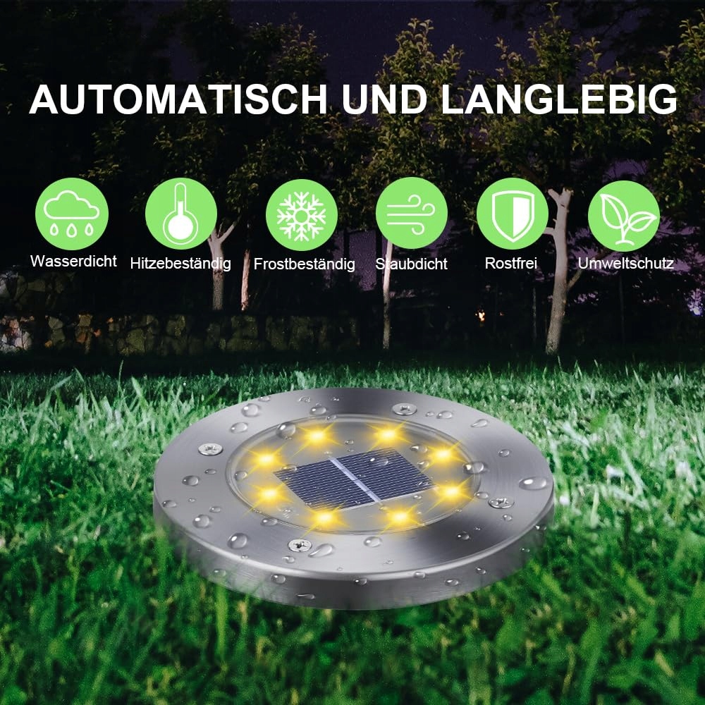 Solarne Lampy Ogrodowe do Ziemi – Każda z tych lamp solarnych do ziemi jest wyposażona w 8 diod LED, które zapewniają jasne i ciepłe białe oświetlenie. Dzięki wbudowanemu czujnikowi światła lampy włączają się automatycznie po zmroku i wyłączają o świcie, co tworzy nastrojową atmosferę i zapewnia bezpieczeństwo na Twoich ścieżkach