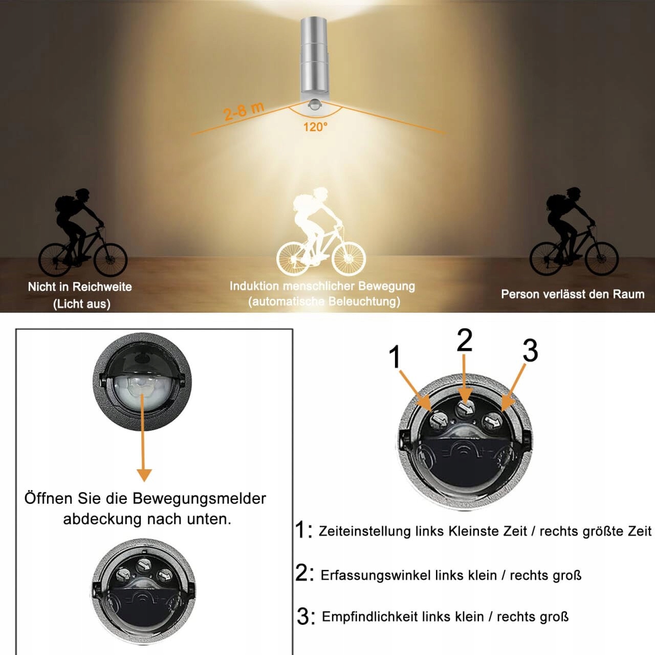 ✅【Czujnik ruchu PIR】 Ta lampa zewnętrzna jest wyposażona w czujnik ruchu PIR, który pozwala ustawić czas świecenia od 15 sekund do 8 minut. Sterowanie LUX jest regulowane od światła nocnego do dziennego, a kąt detekcji PIR wynosi 120° przy maksymalnym zasięgu 8 m. Możesz łatwo dostosować tryb do swoich potrzeb.