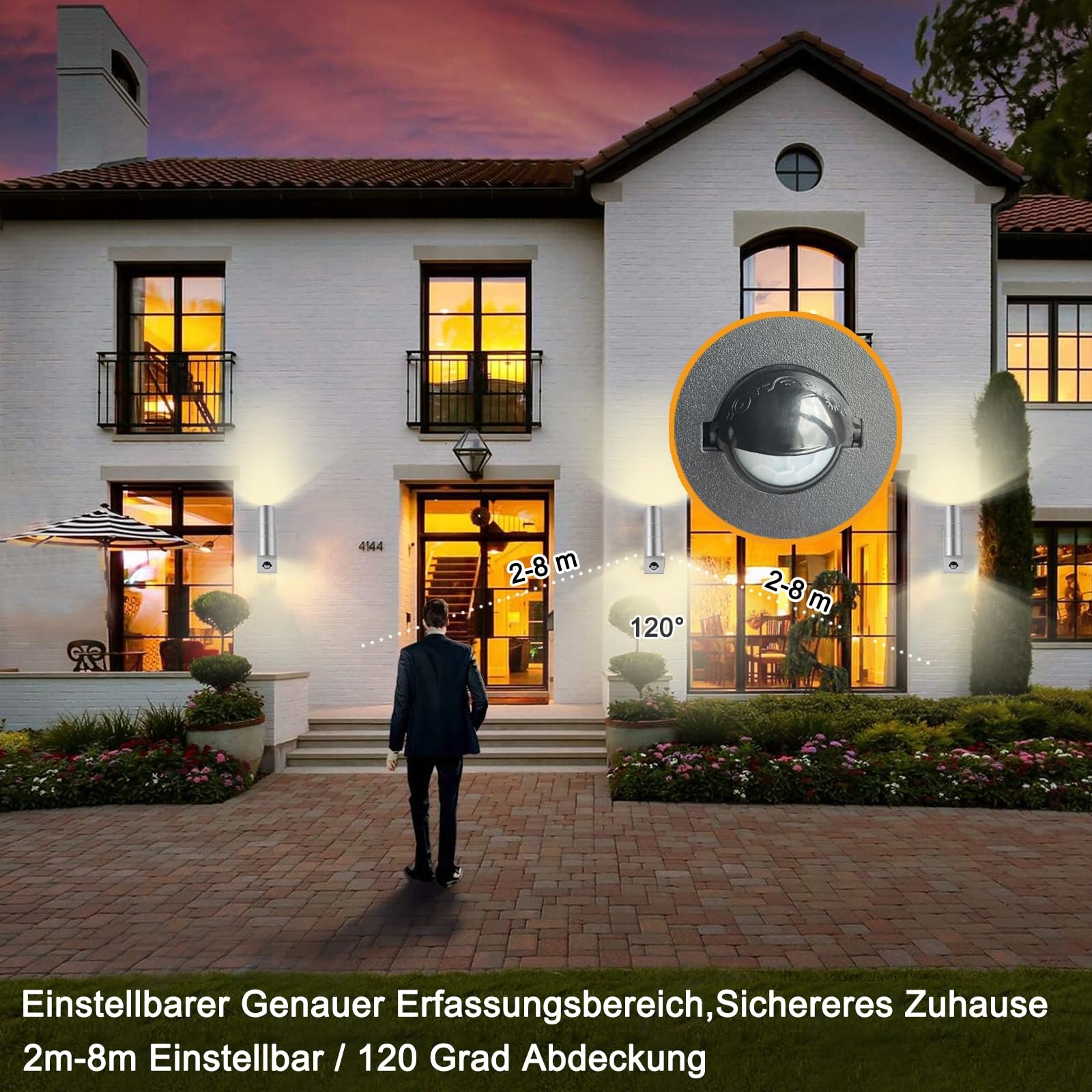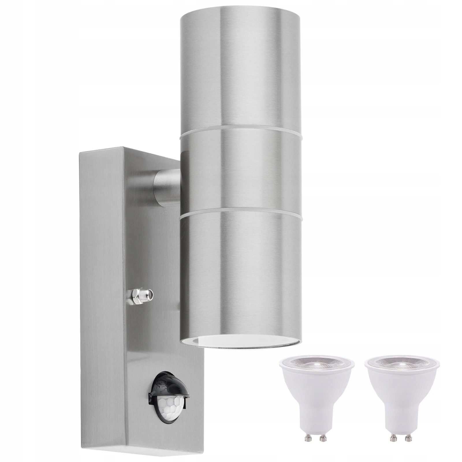qfzwj Lampa zewnętrzna ze stali nierdzewnej z czujnikiem ruchu, 2x oprawka GU10, lampa zewnętrzna IP65 wodoodporna z czujnikiem ruchu, srebrna 230V kinkiet na ogród taras