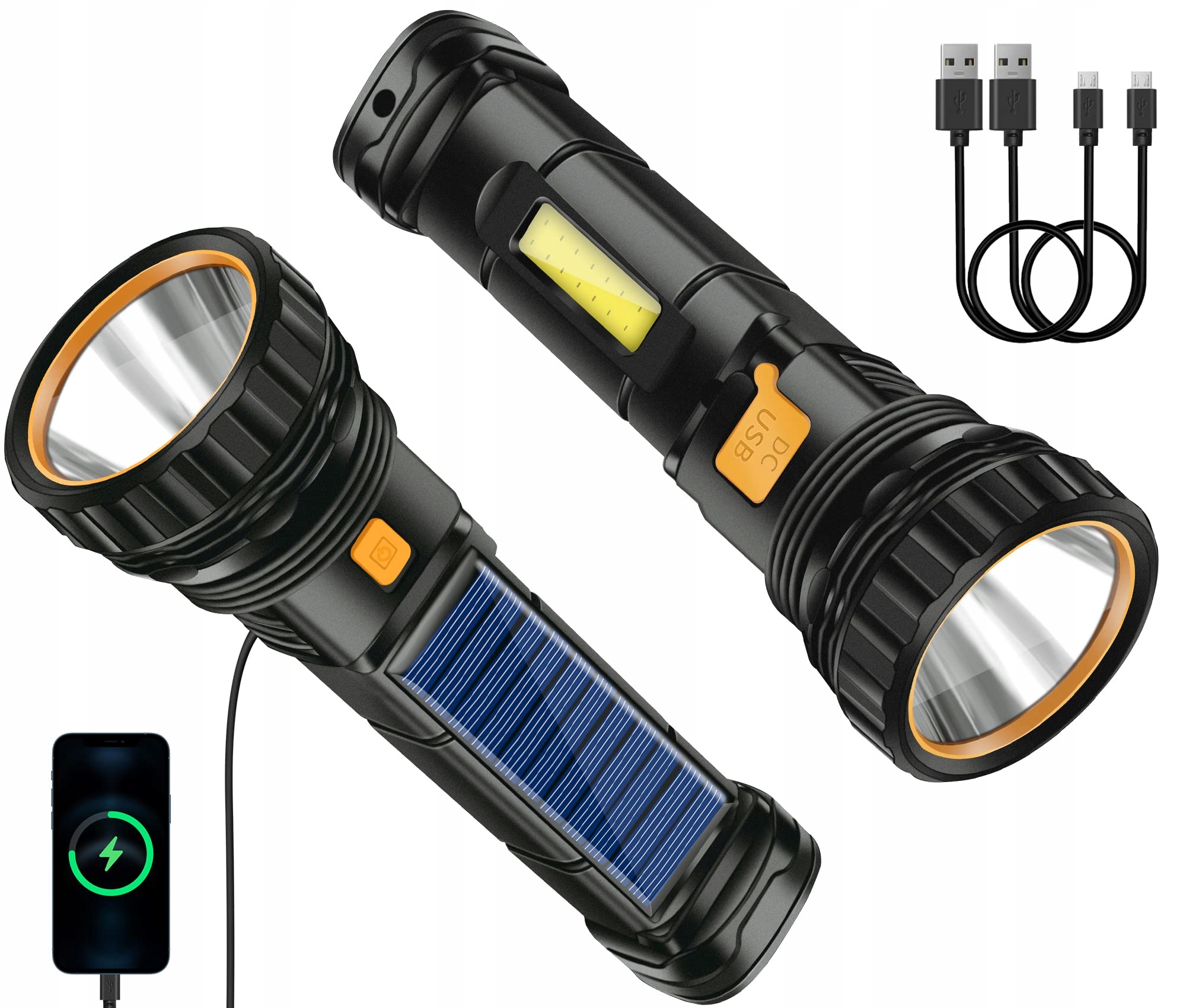 Qoolife Solar LED Latarka, 2 sztuki zasilana bateriami wodoodporna latarka z wbudowaną baterią 1200mAh, latarka USB z 3 trybami świetlnymi, lekka latarka LED ładowalna na zewnątrz