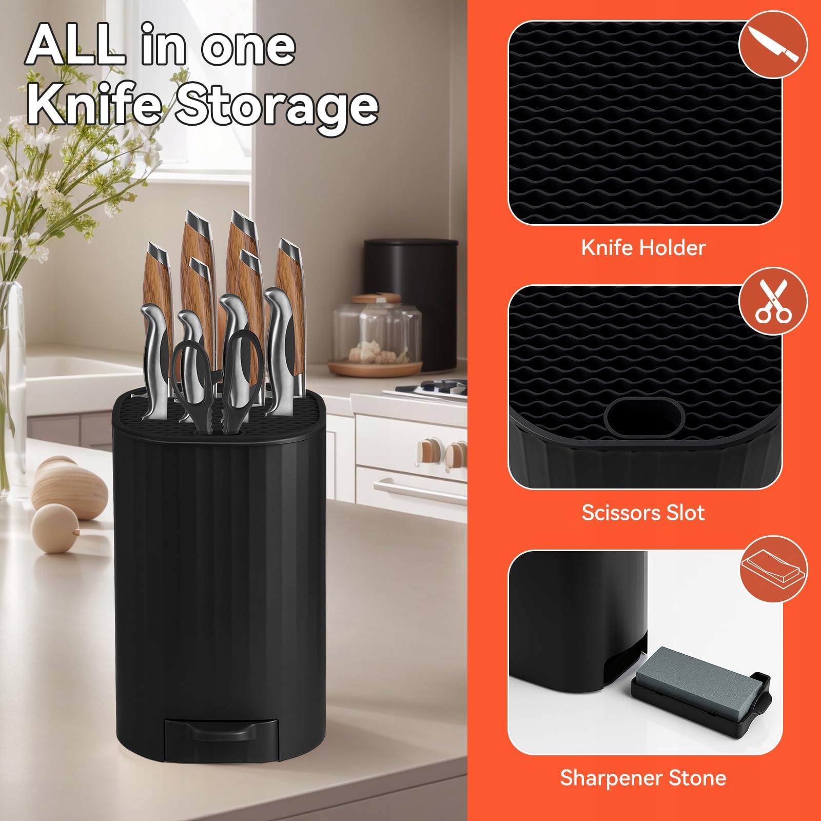 【Wszechstronny design 4 w 1】Blok na noże 4 w 1 bez noży wykonany z wysokiej jakości materiału PP jest nie tylko kompatybilny z różnymi rodzajami noży, ale także posiada dodatkowe miejsca do przechowywania nożyczek oraz ostrzałkę. Zintegrowana podstawa z kamieniem do ostrzenia umożliwia łatwe naostrzenie ostrzy poprzez przeciągnięcie noża po kamieniu.
