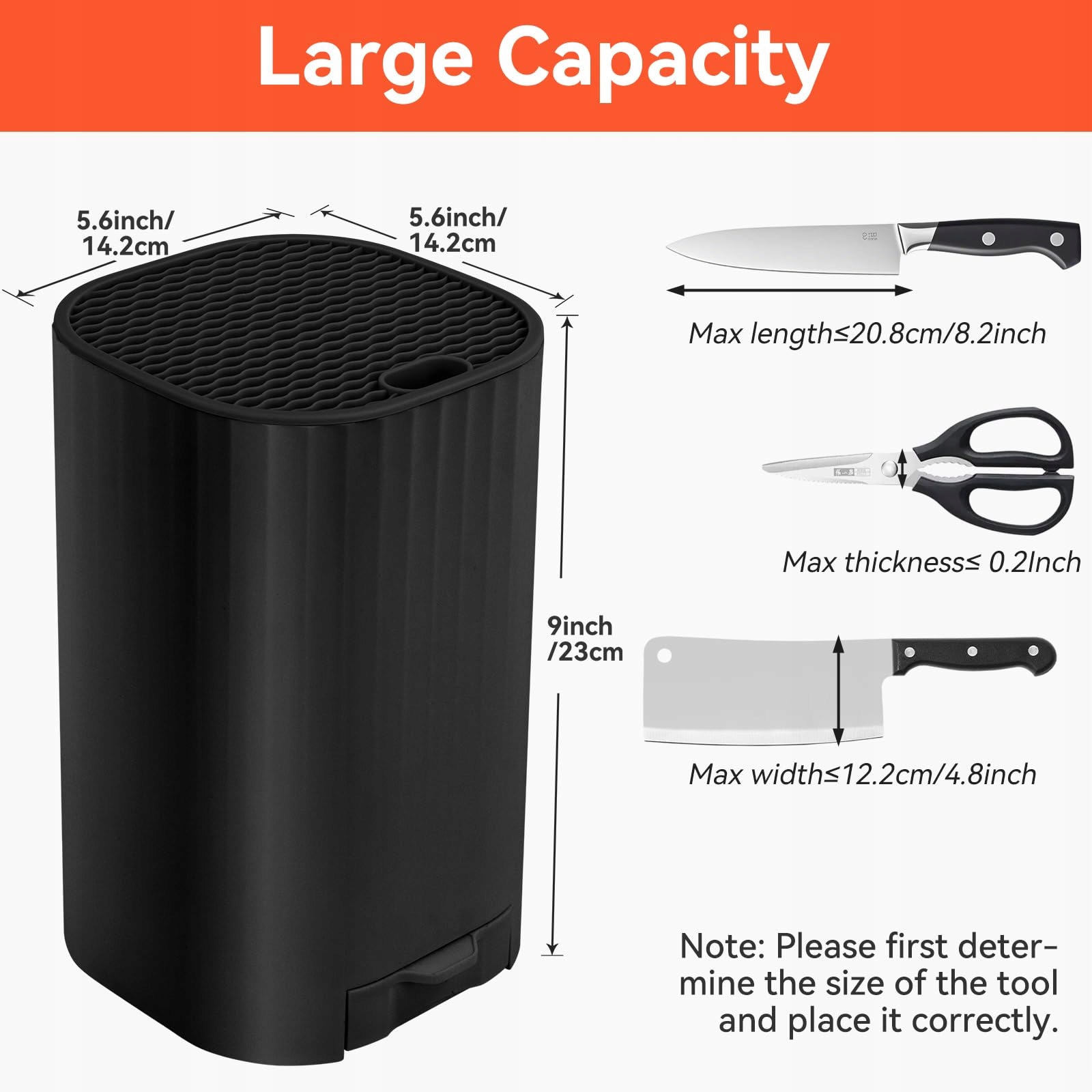 【Przestronny blok do przechowywania noży】Ten uniwersalny uchwyt na noże bez noży mieści wiele rodzajów noży, w tym noże do warzyw, małe noże kuchenne, noże do chleba, noże do tranchowania, noże kuchenne, noże uniwersalne i noże do steków. Maksymalna długość ostrza wynosi 22 cm, a maksymalna szerokość ostrza 12,5 cm, dzięki czemu spełnia wymagania dotyczące przechowywania noży o różnych rozmiarach.