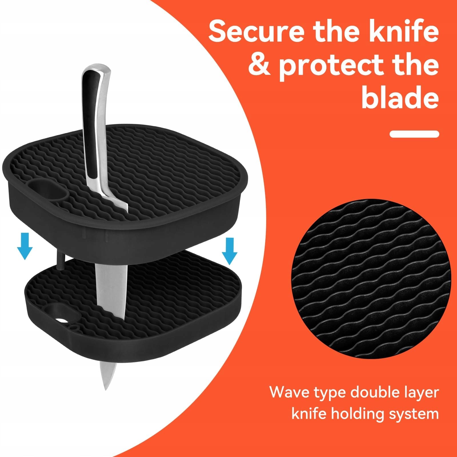 【Podwójna warstwa falista】Design z falistą warstwą uchwytu na noże zapewnia równomierny odstęp między ostrzami, zapobiegając ich kontaktowi lub zarysowaniom. Maksymalizuje to ochronę ostrzy i wydłuża żywotność Twoich noży. Dodatkowo obciążona podstawa gwarantuje niski środek ciężkości, dzięki czemu blok jest stabilny i bezpieczny, zapobiegając chybotaniu się lub przewróceniu.