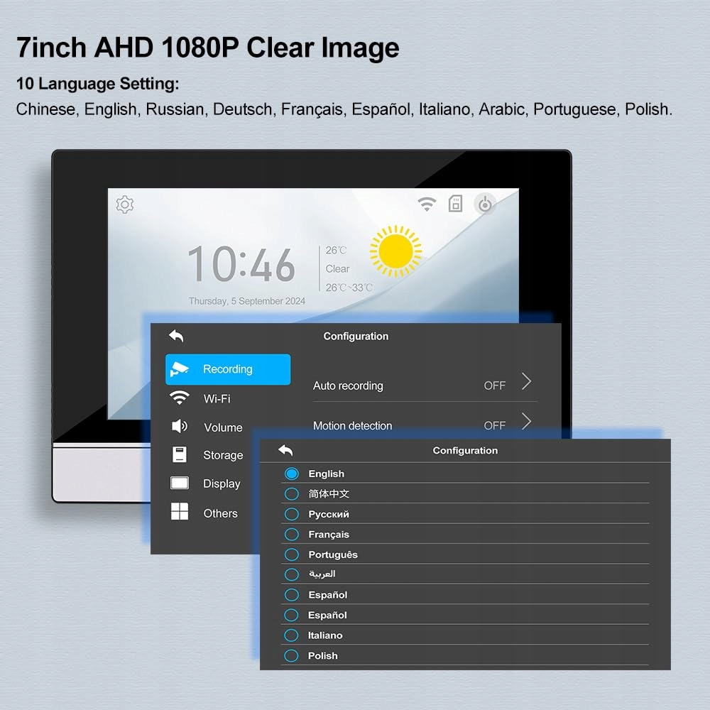 【7-calowy kolorowy monitor wewnętrzny WiFi】Łatwa obsługa za pomocą ekranu dotykowego. Obsługuje dwukierunkową komunikację głosową, nagrywanie, monitorowanie, odblokowywanie. Obsługuje 10 języków, w tym angielski, chiński, rosyjski, francuski, niemiecki, arabski, portugalski, hiszpański, włoski i polski.