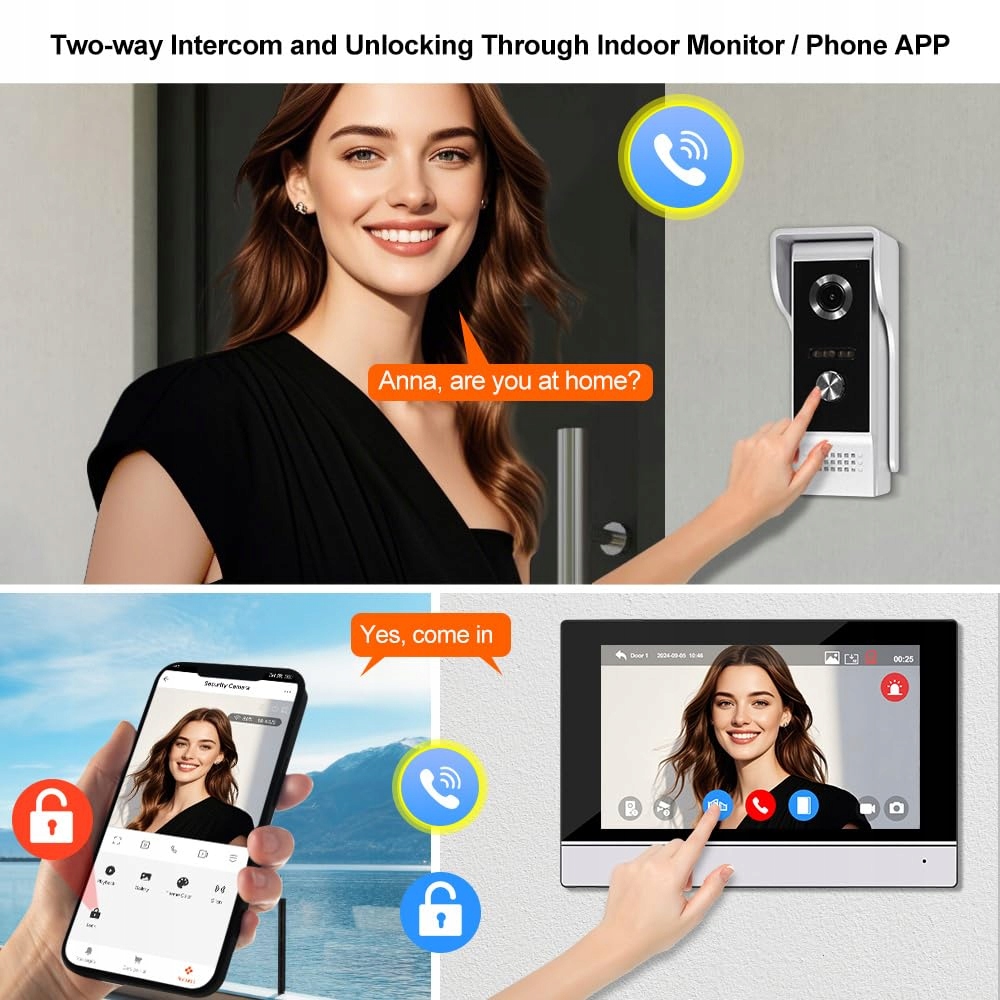 【Podgląd na żywo w aplikacji i zdalne odblokowywanie】Obsługa aplikacji ''Tuya Smart'' do rozmów, odblokowywania, nagrywania, robienia zdjęć. Gdy goście naciśną dzwonek, możesz ich zobaczyć, usłyszeć i porozmawiać z nimi, a nawet zdalnie odblokować drzwi.