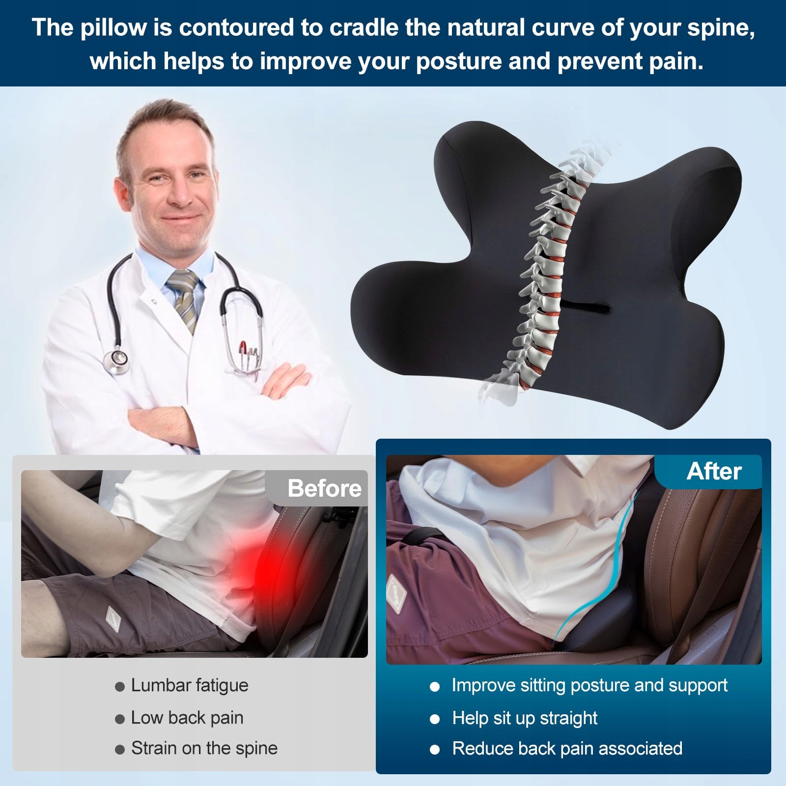 Ergonomiczny design dla lepszego wsparcia: Ta poduszka lędźwiowa wykonana jest z wysokodensyfikowanej pianki pamięciowej, która dostosowuje się do naturalnej krzywizny kręgosłupa i zapewnia dostosowane wsparcie. Ergonomiczny design zapewnia prawidłową postawę ciała i redukuje obciążenie dolnych mięśni pleców podczas długich podróży lub dłuższego siedzenia.