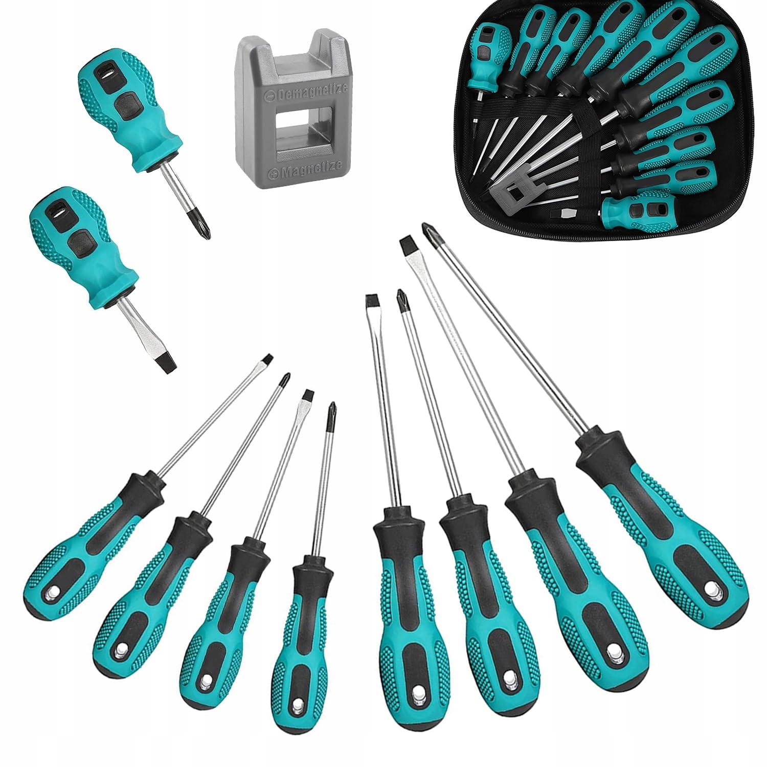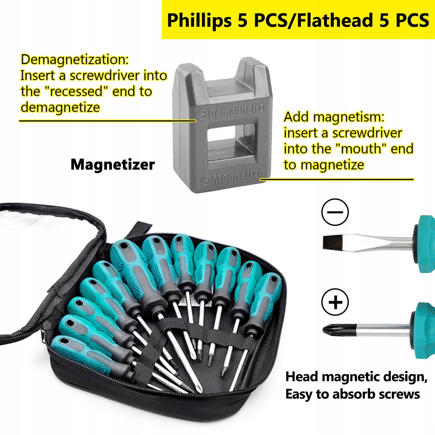 Silne magnetyczne końcówki: Każdy magnetyczny wkrętak ma silną magnetyczną końcówkę, która łatwo trzyma i podnosi śruby. Głowicę wkrętaka można zmagnetyzować lub demagnetyzować za pomocą dołączonego narzędzia magnetycznego.